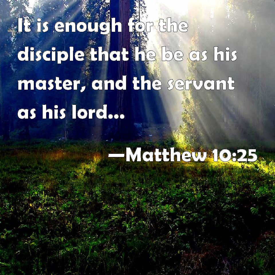 Choose a Background Matthew 10:25 It is enough for the disciple that he be as his master, and the servant as his lord. If they have called the master of the house Beelzebub, how much more shall they call them of his household? KJV: It is enough for the disciple that he be as his master, and the servant as his lord. If they have called the master of the house Beelzebub, how much more shall they call them of his household? DRB: It is enough for the disciple that he be as his master, and the servant as his lord. If they have called the goodman of the house Beelzebub, how much more them of his household? DBT: It is sufficient for the disciple that he should become as his teacher, and the bondman as his lord. If they have called the master of the house Beelzebub, how much more those of his household? ERV: It is enough for the disciple that he be as his master, and the servant as his lord. If they have called the master of the house Beelzebub, how much more shall they call them of his household! WBT: It is enough for the disciple that he should be as his teacher, and the servant as his lord: if they have called the master of the house Beelzebub, how much more will they call them of his household? WEB: It is enough for the disciple that he be like his teacher, and the servant like his lord. If they have called the master of the house Beelzebul, how much more those of his household! YLT: sufficient to the disciple that he may be as his teacher, and the servant as his lord; if the master of the house they did call Beelzeboul, how much more those of his household?Links Matthew 10:25 NIV • Matthew 10:25 NLT • Matthew 10:25 ESV • Matthew 10:25 NASB • Matthew 10:25 KJV • Matthew 10:25 Interlinear • Matthew 10:25 Commentaries • Matthew 10:25 Parallel Texts • Matthew 10:25 Bible Apps • Matthew 10:25 Parallel • Bible Hub |