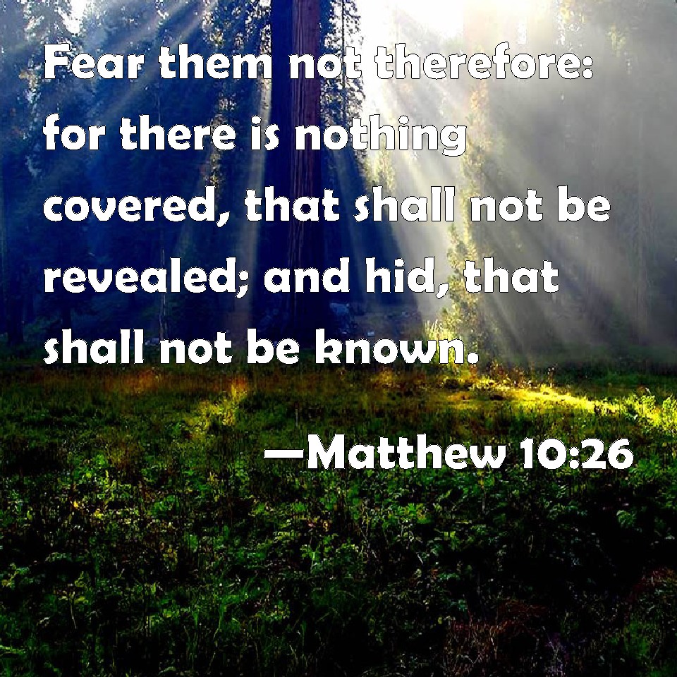 Choose a Background Matthew 10:26 Fear them not therefore: for there is nothing covered, that shall not be revealed; and hid, that shall not be known. KJV: Fear them not therefore: for there is nothing covered, that shall not be revealed; and hid, that shall not be known. DRB: Therefore fear them not. For nothing is covered that shall not be revealed: nor hid, that shall not be known. DBT: Fear them not therefore; for there is nothing covered which shall not be revealed, and secret which shall not be known. ERV: Fear them not therefore: for there is nothing covered, that shall not be revealed; and hid, that shall not be known. WBT: Fear them not therefore: for there is nothing covered, that shall not be revealed; and hid, that shall not be known. WEB: Therefore don't be afraid of them, for there is nothing covered that will not be revealed; and hidden that will not be known. YLT: 'Ye may not, therefore, fear them, for there is nothing covered, that shall not be revealed, and hid, that shall not be known;Links Matthew 10:26 NIV • Matthew 10:26 NLT • Matthew 10:26 ESV • Matthew 10:26 NASB • Matthew 10:26 KJV • Matthew 10:26 Interlinear • Matthew 10:26 Commentaries • Matthew 10:26 Parallel Texts • Matthew 10:26 Bible Apps • Matthew 10:26 Parallel • Bible Hub |