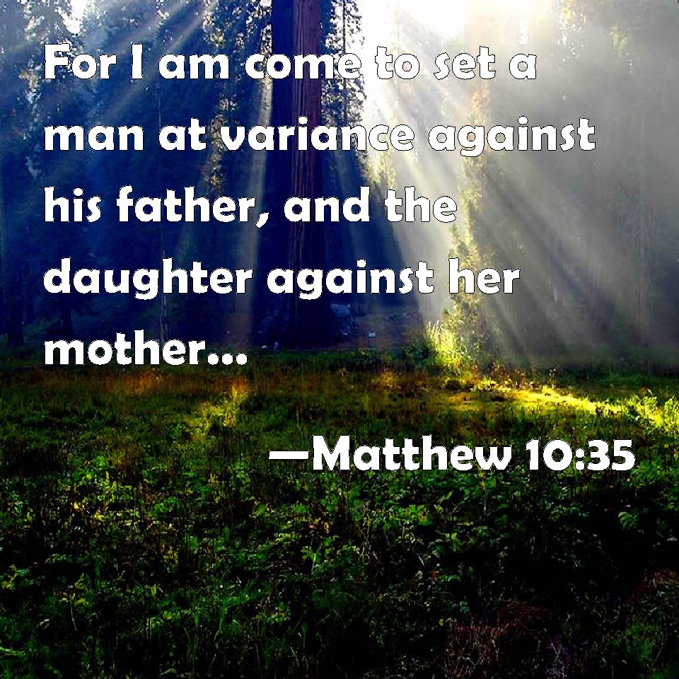 Choose a Background Matthew 10:35 For I am come to set a man at variance against his father, and the daughter against her mother, and the daughter in law against her mother in law. KJV: For I am come to set a man at variance against his father, and the daughter against her mother, and the daughter in law against her mother in law. DRB: For I came to set a man at variance against his father, and the daughter against her mother, and the daughter in law against her mother in law. DBT: For I have come to set a man at variance with his father, and the daughter with her mother, and the daughter-in-law with her mother-in-law; ERV: For I came to set a man at variance against his father, and the daughter against her mother, and the daughter in law against her mother in law: WBT: For I am come to set a man at variance against his father, and the daughter against her mother, and the daughter-in-law against her mother-in-law. WEB: For I came to set a man at odds against his father, and a daughter against her mother, and a daughter-in-law against her mother-in-law. YLT: for I came to set a man at variance against his father, and a daughter against her mother, and a daughter-in-law against her mother-in-law,Links Matthew 10:35 NIV • Matthew 10:35 NLT • Matthew 10:35 ESV • Matthew 10:35 NASB • Matthew 10:35 KJV • Matthew 10:35 Interlinear • Matthew 10:35 Commentaries • Matthew 10:35 Parallel Texts • Matthew 10:35 Bible Apps • Matthew 10:35 Parallel • Bible Hub |