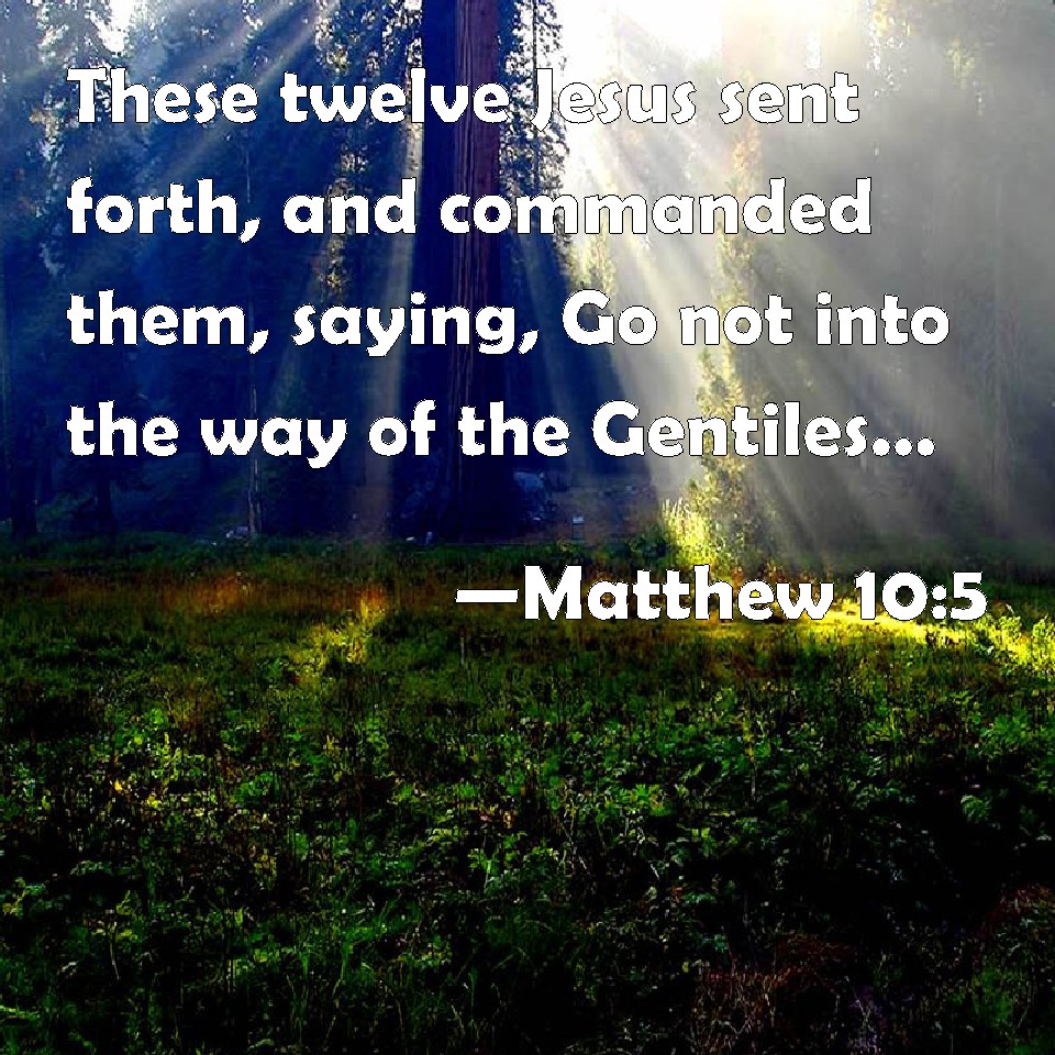 Choose a Background Matthew 10:5 These twelve Jesus sent forth, and commanded them, saying, Go not into the way of the Gentiles, and into any city of the Samaritans enter you not: KJV: These twelve Jesus sent forth, and commanded them, saying, Go not into the way of the Gentiles, and into any city of the Samaritans enter ye not: DRB: These twelve Jesus sent: commanding them, saying: Go ye not into the way of the Gentiles, and into the city of the Samaritans enter ye not. DBT: These twelve Jesus sent out when he had charged them, saying, Go not off into the way of the nations, and into a city of Samaritans enter ye not; ERV: These twelve Jesus sent forth, and charged them, saying, Go not into any way of the Gentiles, and enter not into any city of the Samaritans: WBT: These twelve Jesus sent forth, and commanded them, saying, Go not into the way of the Gentiles, and enter ye not into any city of the Samaritans. WEB: Jesus sent these twelve out, and commanded them, saying, "Don't go among the Gentiles, and don't enter into any city of the Samaritans. YLT: These twelve did Jesus send forth, having given command to them, saying, 'To the way of the nations go not away, and into a city of the Samaritans go not in,Links Matthew 10:5 NIV • Matthew 10:5 NLT • Matthew 10:5 ESV • Matthew 10:5 NASB • Matthew 10:5 KJV • Matthew 10:5 Interlinear • Matthew 10:5 Commentaries • Matthew 10:5 Parallel Texts • Matthew 10:5 Bible Apps • Matthew 10:5 Parallel • Bible Hub |