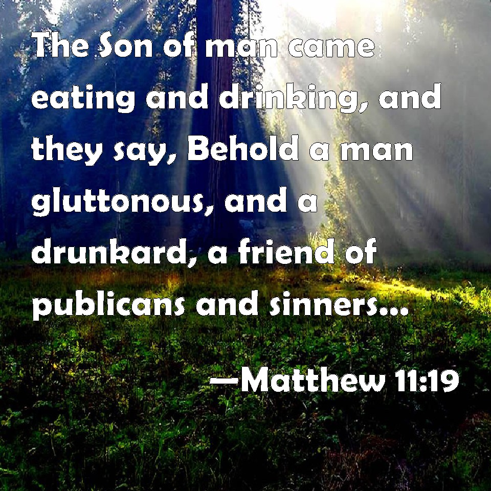Choose a Background Matthew 11:19 The Son of man came eating and drinking, and they say, Behold a man gluttonous, and a drunkard, a friend of publicans and sinners. But wisdom is justified of her children. KJV: The Son of man came eating and drinking, and they say, Behold a man gluttonous, and a winebibber, a friend of publicans and sinners. But wisdom is justified of her children. DRB: The Son of man came eating and drinking, and they say: Behold a man that is a glutton and a wine drinker, a friend of publicans and sinners. And wisdom is justified by her children. DBT: The Son of man has come eating and drinking, and they say, Behold, a man that is eating and wine-drinking, a friend of tax-gatherers, and of sinners: and wisdom has been justified by her children. ERV: The Son of man came eating and drinking, and they say, Behold, a gluttonous man, and a winebibber, a friend of publicans and sinners! And wisdom is justified by her works. WBT: The Son of man came eating and drinking, and they say, Behold, a man gluttonous, and a wine-bibber, a friend of publicans and sinners. But wisdom is justified by her children. WEB: The Son of Man came eating and drinking, and they say, 'Behold, a gluttonous man and a drunkard, a friend of tax collectors and sinners!' But wisdom is justified by her children." YLT: the Son of Man came eating and drinking, and they say, Lo, a man, a glutton, and a wine-drinker, a friend of tax-gatherers and sinners, and wisdom was justified of her children.'Links Matthew 11:19 NIV • Matthew 11:19 NLT • Matthew 11:19 ESV • Matthew 11:19 NASB • Matthew 11:19 KJV • Matthew 11:19 Interlinear • Matthew 11:19 Commentaries • Matthew 11:19 Parallel Texts • Matthew 11:19 Bible Apps • Matthew 11:19 Parallel • Bible Hub |