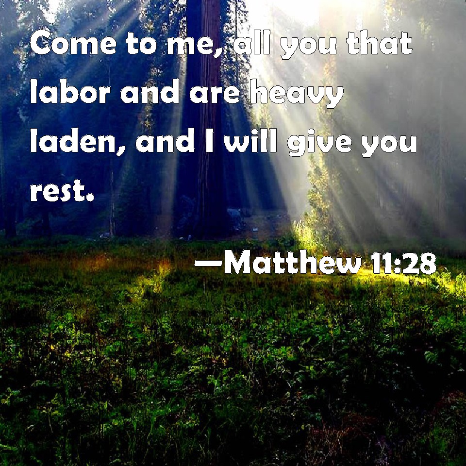 Choose a Background Matthew 11:28 Come to me, all you that labor and are heavy laden, and I will give you rest. KJV: Come unto me, all ye that labour and are heavy laden, and I will give you rest. DRB: Come to me, all you that labour, and are burdened, and I will refresh you. DBT: Come to me, all ye who labour and are burdened, and I will give you rest. ERV: Come unto me, all ye that labour and are heavy laden, and I will give you rest. WBT: Come to me, all ye that labor, and are heavy laden, and I will give you rest. WEB: "Come to me, all you who labor and are heavily burdened, and I will give you rest. YLT: 'Come unto me, all ye labouring and burdened ones, and I will give you rest,Links Matthew 11:28 NIV • Matthew 11:28 NLT • Matthew 11:28 ESV • Matthew 11:28 NASB • Matthew 11:28 KJV • Matthew 11:28 Interlinear • Matthew 11:28 Commentaries • Matthew 11:28 Parallel Texts • Matthew 11:28 Bible Apps • Matthew 11:28 Parallel • Bible Hub |