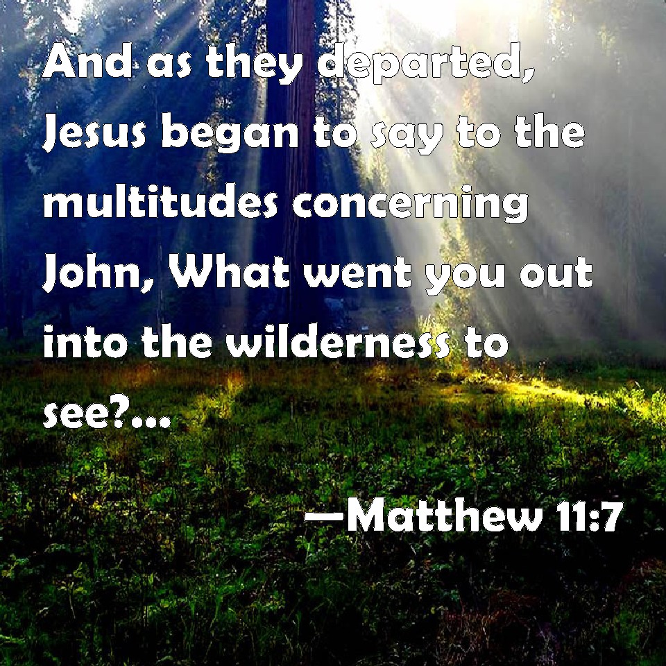 Choose a Background Matthew 11:7 And as they departed, Jesus began to say to the multitudes concerning John, What went you out into the wilderness to see? A reed shaken with the wind? KJV: And as they departed, Jesus began to say unto the multitudes concerning John, What went ye out into the wilderness to see? A reed shaken with the wind? DRB: And when they went their way, Jesus began to say to the multitudes concerning John: What went you out into the desert to see? a reed shaken with the wind? DBT: But as they went away, Jesus began to say to the crowds concerning John, What went ye out into the wilderness to see? a reed moved about by the wind? ERV: And as these went their way, Jesus began to say unto the multitudes concerning John, What went ye out into the wilderness to behold? a reed shaken with the wind? WBT: And as they departed, Jesus began to say to the multitudes concerning John, What went ye out into the wilderness to see? a reed shaken with the wind? WEB: As these went their way, Jesus began to say to the multitudes concerning John, "What did you go out into the wilderness to see? A reed shaken by the wind? YLT: And as they are going, Jesus began to say to the multitudes concerning John, 'What went ye out to the wilderness to view? — a reed shaken by the wind?Links Matthew 11:7 NIV • Matthew 11:7 NLT • Matthew 11:7 ESV • Matthew 11:7 NASB • Matthew 11:7 KJV • Matthew 11:7 Interlinear • Matthew 11:7 Commentaries • Matthew 11:7 Parallel Texts • Matthew 11:7 Bible Apps • Matthew 11:7 Parallel • Bible Hub |