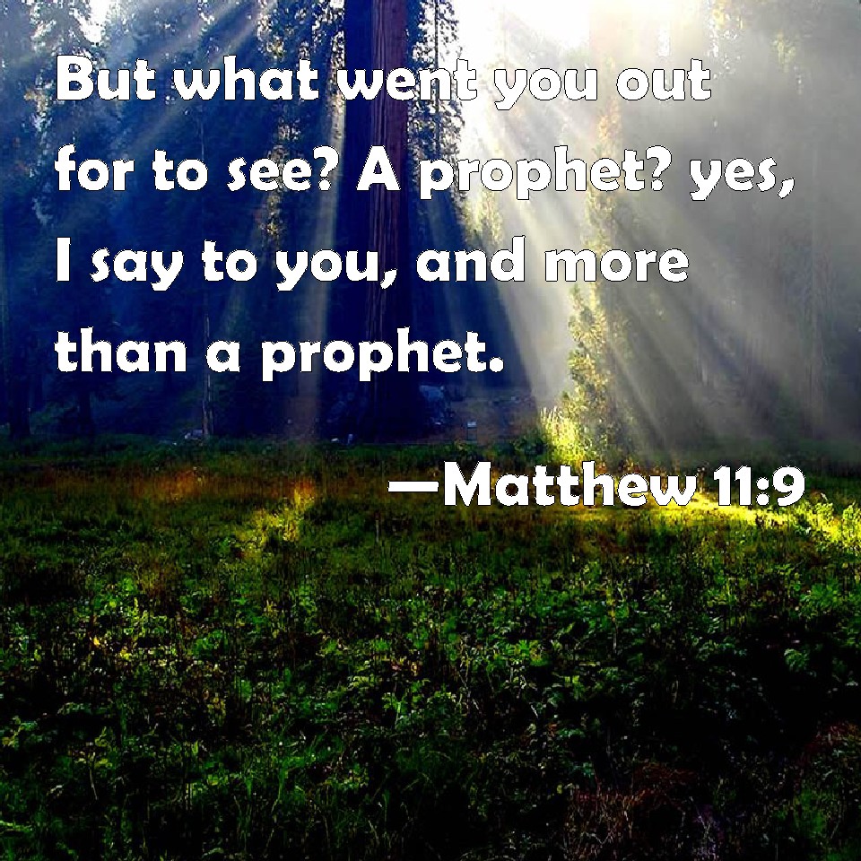 Choose a Background Matthew 11:9 But what went you out for to see? A prophet? yes, I say to you, and more than a prophet. KJV: But what went ye out for to see? A prophet? yea, I say unto you, and more than a prophet. DRB: But what went you out to see? a prophet? yea I tell you, and more than a prophet. DBT: But what went ye out to see? a prophet? Yea, I say to you, and more than a prophet: ERV: But wherefore went ye out? to see a prophet? Yea, I say unto you, and much more than a prophet. WBT: But what went ye out to see? A prophet? yes, I say to you, and more than a prophet. WEB: But why did you go out? To see a prophet? Yes, I tell you, and much more than a prophet. YLT: But what went ye out to see? — a prophet? yes, I say to you, and more than a prophet,Links Matthew 11:9 NIV • Matthew 11:9 NLT • Matthew 11:9 ESV • Matthew 11:9 NASB • Matthew 11:9 KJV • Matthew 11:9 Interlinear • Matthew 11:9 Commentaries • Matthew 11:9 Parallel Texts • Matthew 11:9 Bible Apps • Matthew 11:9 Parallel • Bible Hub |