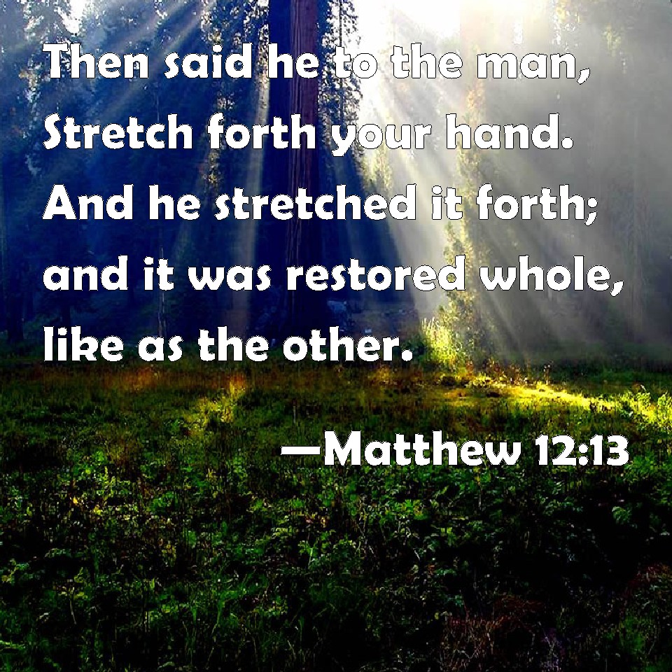 Choose a Background Matthew 12:13 Then said he to the man, Stretch forth your hand. And he stretched it forth; and it was restored whole, like as the other. KJV: Then saith he to the man, Stretch forth thine hand. And he stretched it forth; and it was restored whole, like as the other. DRB: Then he saith to the man: Stretch forth thy hand; and he stretched it forth, and it was restored to health even as the other. DBT: Then he says to the man, Stretch out thy hand. And he stretched it out, and it was restored sound as the other. ERV: Then saith he to the man, Stretch forth thy hand. And he stretched it forth; and it was restored whole, as the other. WBT: Then saith he to the man, Stretch out thy hand. And he stretched it out; and it was restored to a sound state like the other. WEB: Then he told the man, "Stretch out your hand." He stretched it out; and it was restored whole, just like the other. YLT: Then saith he to the man, 'Stretch forth thy hand,' and he stretched it forth, and it was restored whole as the other.Links Matthew 12:13 NIV • Matthew 12:13 NLT • Matthew 12:13 ESV • Matthew 12:13 NASB • Matthew 12:13 KJV • Matthew 12:13 Interlinear • Matthew 12:13 Commentaries • Matthew 12:13 Parallel Texts • Matthew 12:13 Bible Apps • Matthew 12:13 Parallel • Bible Hub |