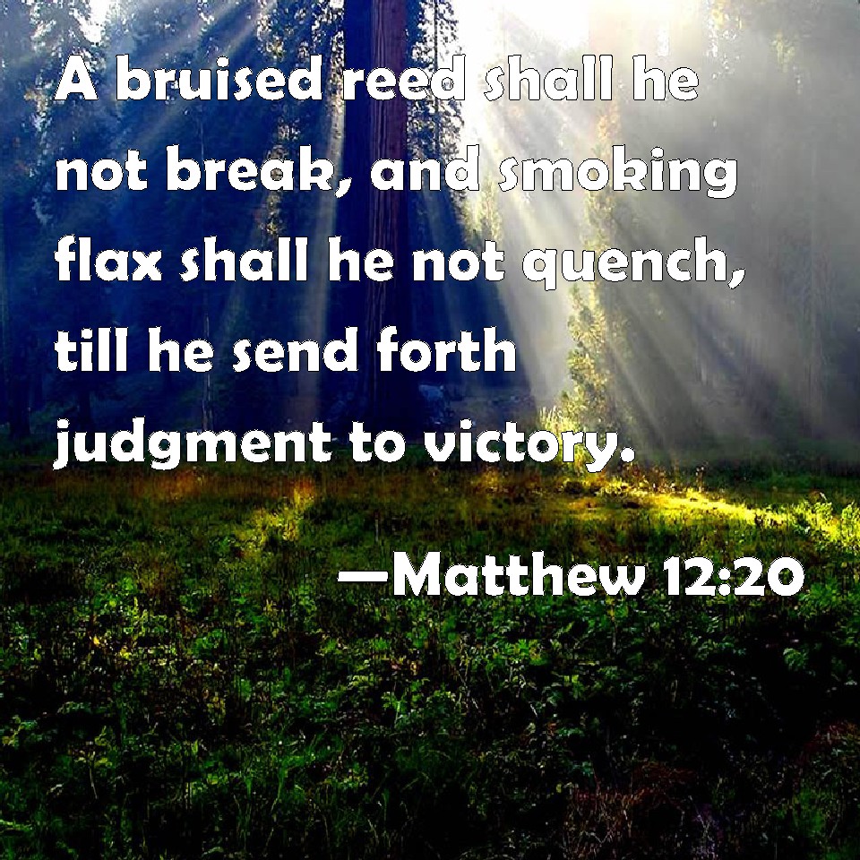 Choose a Background Matthew 12:20 A bruised reed shall he not break, and smoking flax shall he not quench, till he send forth judgment to victory. KJV: A bruised reed shall he not break, and smoking flax shall he not quench, till he send forth judgment unto victory. DRB: The bruised reed he shall not break: and smoking flax he shall not extinguish: till he send forth judgment unto victory. DBT: a bruised reed shall he not break, and smoking flax shall he not quench, until he bring forth judgment unto victory; ERV: A bruised reed shall he not break, And smoking flax shall he not quench, Till he send forth judgment unto victory. WBT: A bruised reed shall he not break, and smoking flax shall he not quench, till he shall send forth judgment to victory. WEB: He won't break a bruised reed. He won't quench a smoking flax, until he leads justice to victory. YLT: a bruised reed he shall not break, and smoking flax he shall not quench, till he may put forth judgment to victory,Links Matthew 12:20 NIV • Matthew 12:20 NLT • Matthew 12:20 ESV • Matthew 12:20 NASB • Matthew 12:20 KJV • Matthew 12:20 Interlinear • Matthew 12:20 Commentaries • Matthew 12:20 Parallel Texts • Matthew 12:20 Bible Apps • Matthew 12:20 Parallel • Bible Hub |