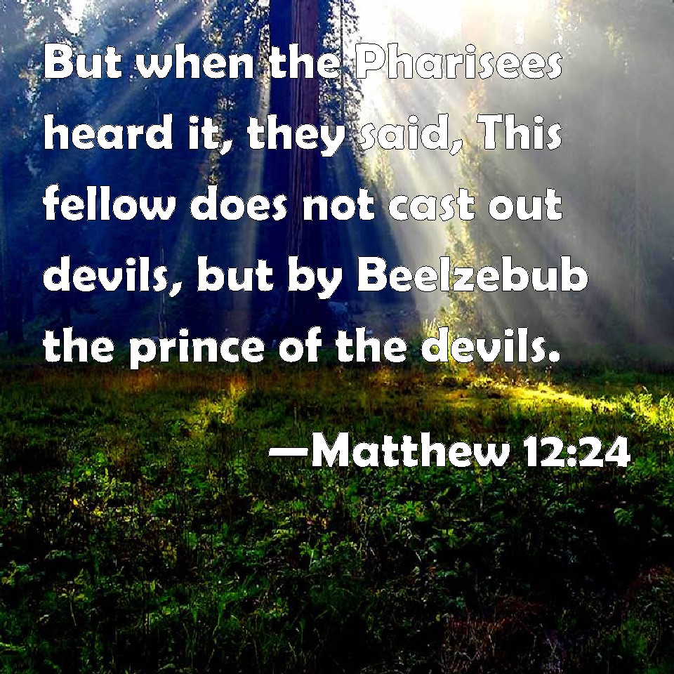Choose a Background Matthew 12:24 But when the Pharisees heard it, they said, This fellow does not cast out devils, but by Beelzebub the prince of the devils. KJV: But when the Pharisees heard it, they said, This fellow doth not cast out devils, but by Beelzebub the prince of the devils. DRB: But the Pharisees hearing it, said: This man casteth not out the devils but by Beelzebub the prince of the devils. DBT: But the Pharisees, having heard it, said, This man does not cast out demons, but by Beelzebub, prince of demons. ERV: But when the Pharisees heard it, they said, This man doth not cast out devils, but by Beelzebub the prince of the devils. WBT: But when the Pharisees heard it, they said, This man doth not cast out demons, but by Beelzebub the prince of the demons. WEB: But when the Pharisees heard it, they said, "This man does not cast out demons, except by Beelzebul, the prince of the demons." YLT: but the Pharisees having heard, said, 'This one doth not cast out demons, except by Beelzeboul, ruler of the demons.'Links Matthew 12:24 NIV • Matthew 12:24 NLT • Matthew 12:24 ESV • Matthew 12:24 NASB • Matthew 12:24 KJV • Matthew 12:24 Interlinear • Matthew 12:24 Commentaries • Matthew 12:24 Parallel Texts • Matthew 12:24 Bible Apps • Matthew 12:24 Parallel • Bible Hub |