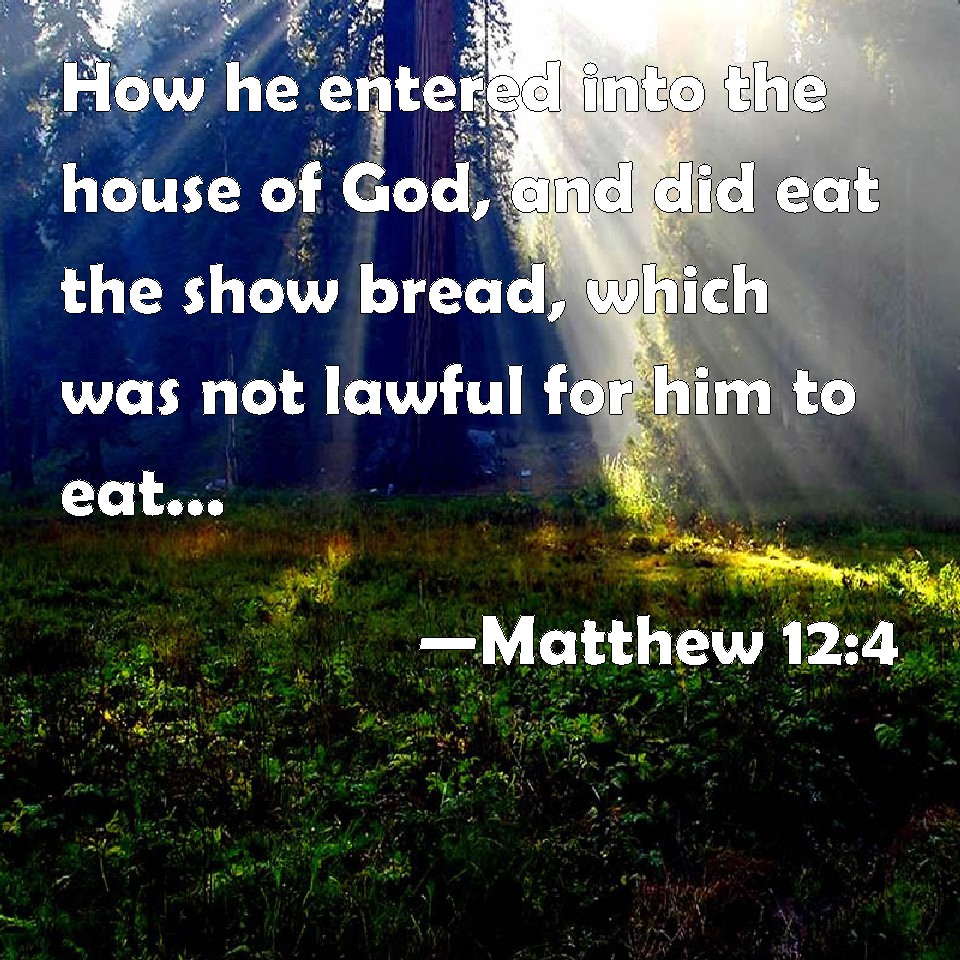 Choose a Background Matthew 12:4 How he entered into the house of God, and did eat the show bread, which was not lawful for him to eat, neither for them which were with him, but only for the priests? KJV: How he entered into the house of God, and did eat the shewbread, which was not lawful for him to eat, neither for them which were with him, but only for the priests? DRB: How he entered into the house of God, and did eat the loaves of proposition, which it was not lawful for him to eat, nor for them that were with him, but for the priests only? DBT: How he entered into the house of God, and ate the shewbread, which it was not lawful for him to eat, nor for those with him, but for the priests only? ERV: how be entered into the house of God, and did eat the shewbread, which it was not lawful for him to eat, neither for them that were with him, but only for the priests? WBT: How he entered into the house of God, and ate the show-bread, which it was not lawful for him to eat, neither for them who were with him, but only for the priests? WEB: how he entered into the house of God, and ate the show bread, which was not lawful for him to eat, neither for those who were with him, but only for the priests? YLT: how he went into the house of God, and the loaves of the presentation did eat, which it is not lawful to him to eat, nor to those with him, except to the priests alone?Links Matthew 12:4 NIV • Matthew 12:4 NLT • Matthew 12:4 ESV • Matthew 12:4 NASB • Matthew 12:4 KJV • Matthew 12:4 Interlinear • Matthew 12:4 Commentaries • Matthew 12:4 Parallel Texts • Matthew 12:4 Bible Apps • Matthew 12:4 Parallel • Bible Hub |