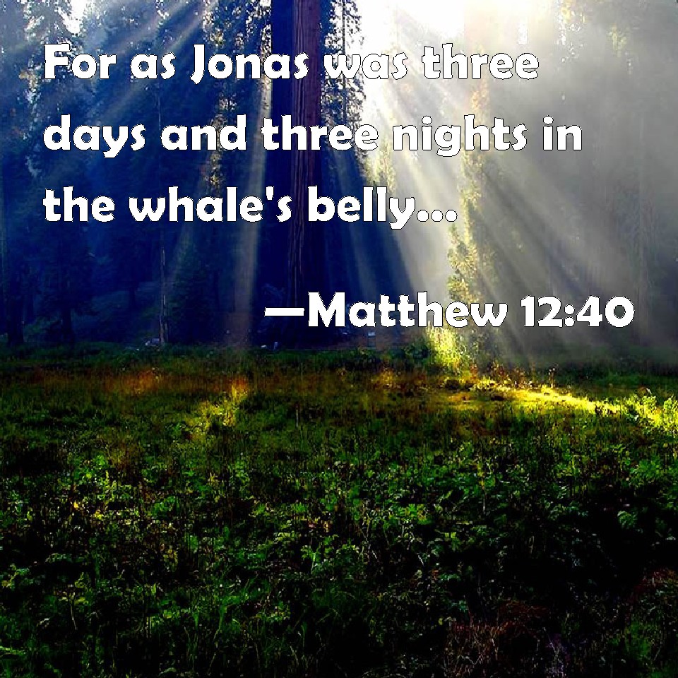 Matthew 12:40 For as Jonas was three days and three nights in the whale's belly; so shall the Son of man be three days and three nights in the heart of the earth.