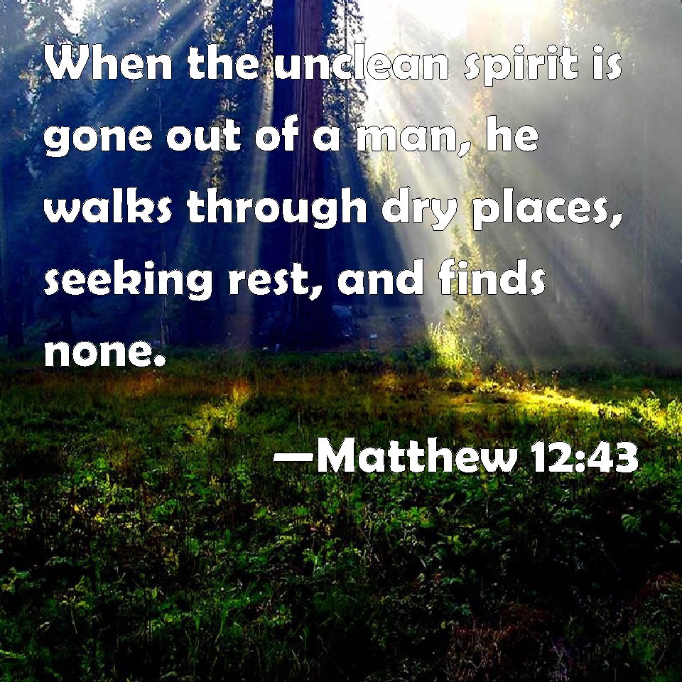 Choose a Background Matthew 12:43 When the unclean spirit is gone out of a man, he walks through dry places, seeking rest, and finds none. KJV: When the unclean spirit is gone out of a man, he walketh through dry places, seeking rest, and findeth none. DRB: And when an unclean spirit is gone out of a man he walketh through dry places seeking rest, and findeth none. DBT: But when the unclean spirit has gone out of the man, he goes through dry places, seeking rest, and does not find it. ERV: But the unclean spirit, when he is gone out of the man, passeth through waterless places, seeking rest, and findeth it not. WBT: When the unclean spirit is gone out of a man, he walketh through dry places, seeking rest, and he findeth none. WEB: But the unclean spirit, when he is gone out of the man, passes through waterless places, seeking rest, and doesn't find it. YLT: 'And, when the unclean spirit may go forth from the man, it doth walk through dry places seeking rest, and doth not find;Links Matthew 12:43 NIV • Matthew 12:43 NLT • Matthew 12:43 ESV • Matthew 12:43 NASB • Matthew 12:43 KJV • Matthew 12:43 Interlinear • Matthew 12:43 Commentaries • Matthew 12:43 Parallel Texts • Matthew 12:43 Bible Apps • Matthew 12:43 Parallel • Bible Hub |
