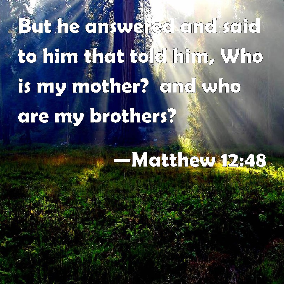 Choose a Background Matthew 12:48 But he answered and said to him that told him, Who is my mother? and who are my brothers? KJV: But he answered and said unto him that told him, Who is my mother? and who are my brethren? DRB: But he answering him that told him, said: Who is my mother, and who are my brethren? DBT: But he answering said to him that spoke to him, Who is my mother, and who are my brethren? ERV: But he answered and said unto him that told him, Who is my mother? and who are my brethren? WBT: But he answered and said to him that told him, Who is my mother? and who are my brethren? WEB: But he answered him who spoke to him, "Who is my mother? Who are my brothers?" YLT: And he answering said to him who spake to him, 'Who is my mother? and who are my brethren?'Links Matthew 12:48 NIV • Matthew 12:48 NLT • Matthew 12:48 ESV • Matthew 12:48 NASB • Matthew 12:48 KJV • Matthew 12:48 Interlinear • Matthew 12:48 Commentaries • Matthew 12:48 Parallel Texts • Matthew 12:48 Bible Apps • Matthew 12:48 Parallel • Bible Hub |