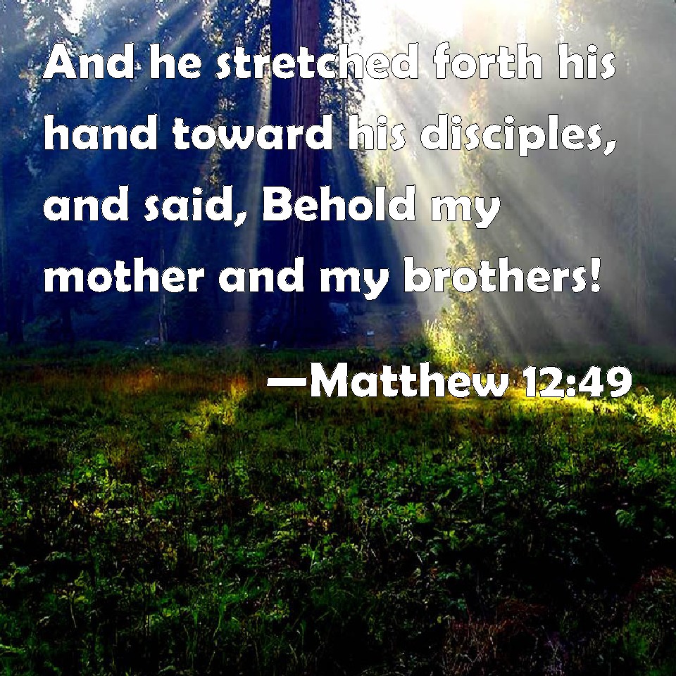 Choose a Background Matthew 12:49 And he stretched forth his hand toward his disciples, and said, Behold my mother and my brothers! KJV: And he stretched forth his hand toward his disciples, and said, Behold my mother and my brethren! DRB: And stretching forth his hand towards his disciples, he said: Behold my mother and my brethren. DBT: And, stretching out his hand to his disciples, he said, Behold my mother and my brethren; ERV: And he stretched forth his hand towards his disciples, and said, Behold, my mother and my brethren! WBT: And he stretched forth his hand towards his disciples, and said, Behold my mother and my brethren! WEB: He stretched out his hand towards his disciples, and said, "Behold, my mother and my brothers! YLT: And having stretched forth his hand toward his disciples, he said, 'Lo, my mother and my brethren!Links Matthew 12:49 NIV • Matthew 12:49 NLT • Matthew 12:49 ESV • Matthew 12:49 NASB • Matthew 12:49 KJV • Matthew 12:49 Interlinear • Matthew 12:49 Commentaries • Matthew 12:49 Parallel Texts • Matthew 12:49 Bible Apps • Matthew 12:49 Parallel • Bible Hub |