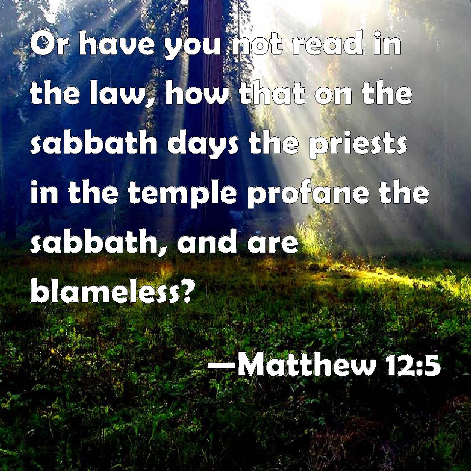 Choose a Background Matthew 12:5 Or have you not read in the law, how that on the sabbath days the priests in the temple profane the sabbath, and are blameless? KJV: Or have ye not read in the law, how that on the sabbath days the priests in the temple profane the sabbath, and are blameless? DRB: Or have ye not read in the law, that on the sabbath days the priests in the temple break the sabbath, and are without blame? DBT: Or have ye not read in the law that on the sabbaths the priests in the temple profane the sabbath, and are blameless? ERV: Or have ye not read in the law, how that on the sabbath day the priests in the temple profane the sabbath, and are guiltless? WBT: Or have ye not read in the law, that on the sabbath the priests in the temple profane the sabbath, and are blameless? WEB: Or have you not read in the law, that on the Sabbath day, the priests in the temple profane the Sabbath, and are guiltless? YLT: 'Or did ye not read in the Law, that on the sabbaths the priests in the temple do profane the sabbath, and are blameless?Links Matthew 12:5 NIV • Matthew 12:5 NLT • Matthew 12:5 ESV • Matthew 12:5 NASB • Matthew 12:5 KJV • Matthew 12:5 Interlinear • Matthew 12:5 Commentaries • Matthew 12:5 Parallel Texts • Matthew 12:5 Bible Apps • Matthew 12:5 Parallel • Bible Hub |