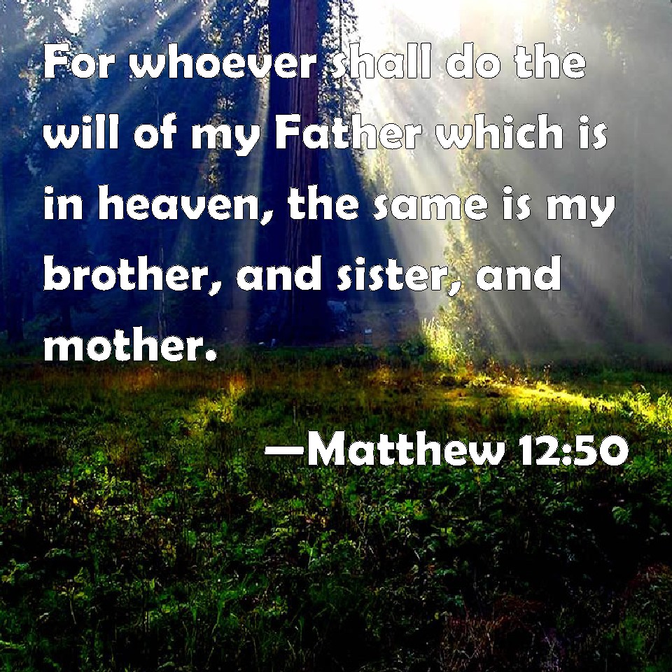 Choose a Background Matthew 12:50 For whoever shall do the will of my Father which is in heaven, the same is my brother, and sister, and mother. KJV: For whosoever shall do the will of my Father which is in heaven, the same is my brother, and sister, and mother. DRB: For whosoever shall do the will of my Father, that is in heaven, he is my brother, and sister, and mother. DBT: for whosoever shall do the will of my Father who is in the heavens, he is my brother, and sister, and mother. ERV: For whosoever shall do the will of my Father which is in heaven, he is my brother, and sister, and mother. WBT: For whoever shall do the will of my Father who is in heaven, the same is my brother, and sister, and mother. WEB: For whoever does the will of my Father who is in heaven, he is my brother, and sister, and mother." YLT: for whoever may do the will of my Father who is in the heavens, he is my brother, and sister, and mother.'Links Matthew 12:50 NIV • Matthew 12:50 NLT • Matthew 12:50 ESV • Matthew 12:50 NASB • Matthew 12:50 KJV • Matthew 12:50 Interlinear • Matthew 12:50 Commentaries • Matthew 12:50 Parallel Texts • Matthew 12:50 Bible Apps • Matthew 12:50 Parallel • Bible Hub |