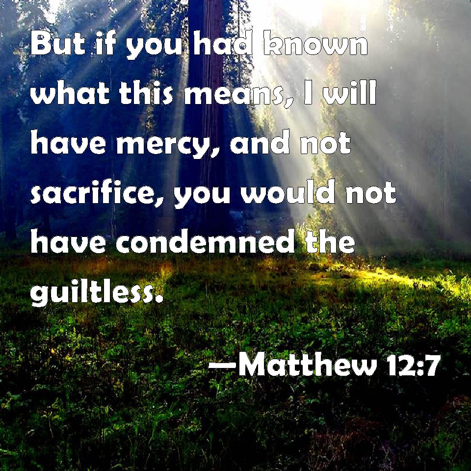 Choose a Background Matthew 12:7 But if you had known what this means, I will have mercy, and not sacrifice, you would not have condemned the guiltless. KJV: But if ye had known what this meaneth, I will have mercy, and not sacrifice, ye would not have condemned the guiltless. DRB: And if you knew what this meaneth: I will have mercy, and not sacrifice: you would never have condemned the innocent. DBT: But if ye had known what is: I will have mercy and not sacrifice, ye would not have condemned the guiltless. ERV: But if ye had known what this meaneth, I desire mercy, and not sacrifice, ye would not have condemned the guiltless. WBT: But if ye had known what this meaneth, I will have mercy, and not sacrifice, ye would not have condemned the guiltless. WEB: But if you had known what this means, 'I desire mercy, and not sacrifice,' you would not have condemned the guiltless. YLT: and if ye had known what is: Kindness I will, and not sacrifice — ye had not condemned the blameless,Links Matthew 12:7 NIV • Matthew 12:7 NLT • Matthew 12:7 ESV • Matthew 12:7 NASB • Matthew 12:7 KJV • Matthew 12:7 Interlinear • Matthew 12:7 Commentaries • Matthew 12:7 Parallel Texts • Matthew 12:7 Bible Apps • Matthew 12:7 Parallel • Bible Hub |