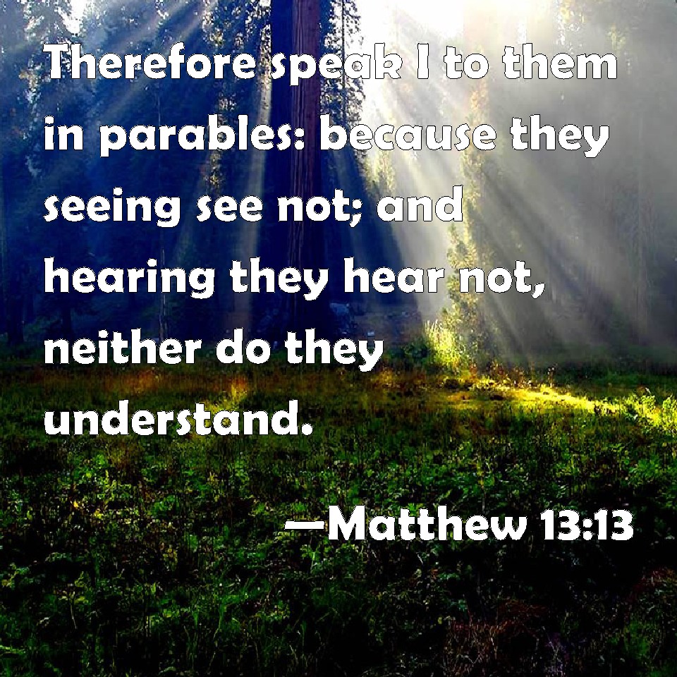 Choose a Background Matthew 13:13 Therefore speak I to them in parables: because they seeing see not; and hearing they hear not, neither do they understand. KJV: Therefore speak I to them in parables: because they seeing see not; and hearing they hear not, neither do they understand. DRB: Therefore do I speak to them in parables: because seeing they see not, and hearing they hear not, neither do they understand. DBT: For this cause I speak to them in parables, because seeing they do not see, and hearing they do not hear nor understand; ERV: Therefore speak I to them in parables; because seeing they see not, and hearing they hear not, neither do they understand. WBT: Therefore I speak to them in parables: because they seeing see not; and hearing they hear not, neither do they understand. WEB: Therefore I speak to them in parables, because seeing they don't see, and hearing, they don't hear, neither do they understand. YLT: 'Because of this, in similes do I speak to them, because seeing they do not see, and hearing they do not hear, nor understand,Links Matthew 13:13 NIV • Matthew 13:13 NLT • Matthew 13:13 ESV • Matthew 13:13 NASB • Matthew 13:13 KJV • Matthew 13:13 Interlinear • Matthew 13:13 Commentaries • Matthew 13:13 Parallel Texts • Matthew 13:13 Bible Apps • Matthew 13:13 Parallel • Bible Hub |