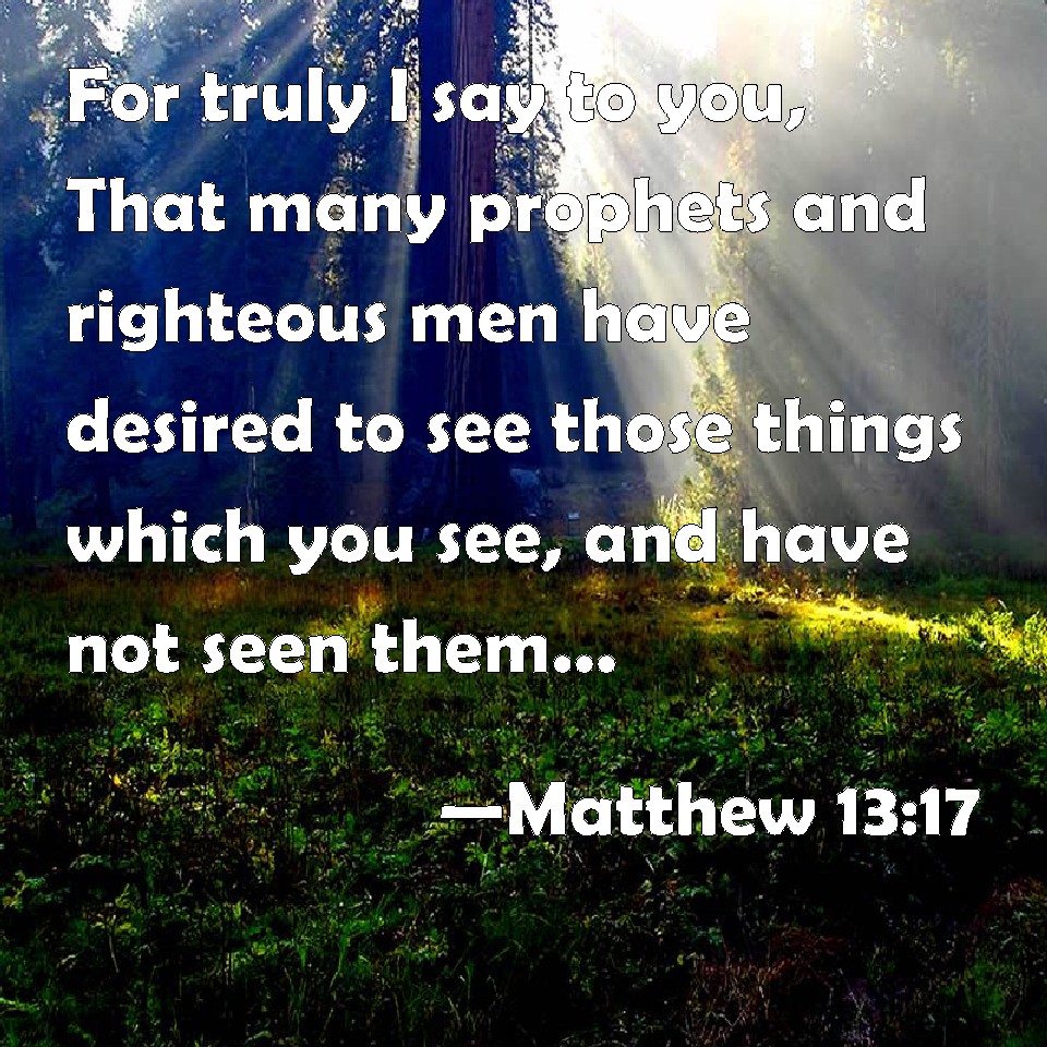 Choose a Background Matthew 13:17 For truly I say to you, That many prophets and righteous men have desired to see those things which you see, and have not seen them; and to hear those things which you hear, and have not heard them. KJV: For verily I say unto you, That many prophets and righteous men have desired to see those things which ye see, and have not seen them; and to hear those things which ye hear, and have not heard them. DRB: For, amen, I say to you, many prophets and just men have desired to see the things that you see, and have not seen them, and to hear the things that you hear and have not heard them. DBT: for verily I say unto you, that many prophets and righteous men have desired to see the things which ye behold and did not see them, and to hear the things which ye hear and did not hear them. ERV: For verily I say unto you, that many prophets and righteous men desired to see the things which ye see, and saw them not; and to hear the things which ye hear, and heard them not. WBT: For verily I say to you, That many prophets and righteous men have desired to see the things which ye see, and have not seen them; and to hear the things which ye hear, and have not heard them. WEB: For most certainly I tell you that many prophets and righteous men desired to see the things which you see, and didn't see them; and to hear the things which you hear, and didn't hear them. YLT: for verily I say to you, that many prophets and righteous men did desire to see that which ye look on, and they did not see, and to hear that which ye hear, and they did not hear.Links Matthew 13:17 NIV • Matthew 13:17 NLT • Matthew 13:17 ESV • Matthew 13:17 NASB • Matthew 13:17 KJV • Matthew 13:17 Interlinear • Matthew 13:17 Commentaries • Matthew 13:17 Parallel Texts • Matthew 13:17 Bible Apps • Matthew 13:17 Parallel • Bible Hub |