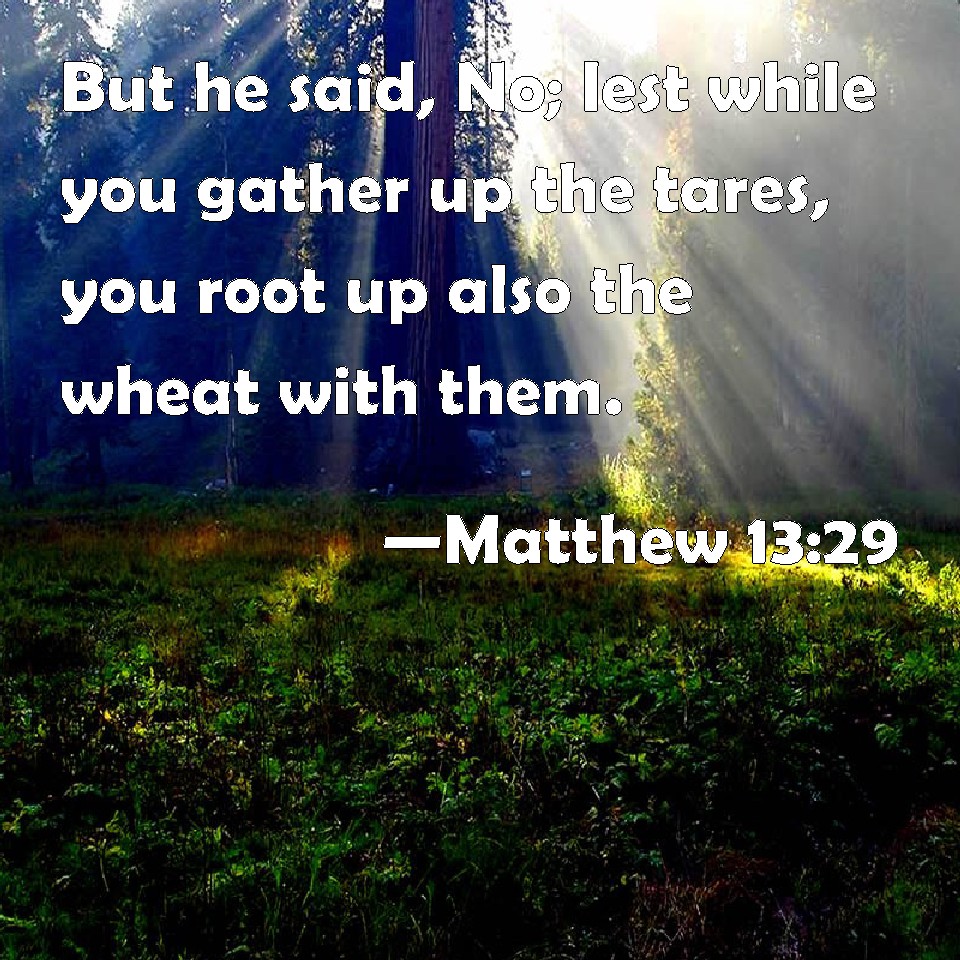 Choose a Background Matthew 13:29 But he said, No; lest while you gather up the tares, you root up also the wheat with them. KJV: But he said, Nay; lest while ye gather up the tares, ye root up also the wheat with them. DRB: And he said: No, lest perhaps gathering up the cockle, you root up the wheat also together with it. DBT: But he said, No; lest in gathering the darnel ye should root up the wheat with it. ERV: But he saith, Nay; lest haply while ye gather up the tares, ye root up the wheat with them. WBT: But he said, No; lest while ye gather the tares, ye root up also the wheat with them. WEB: "But he said, 'No, lest perhaps while you gather up the darnel weeds, you root up the wheat with them. YLT: And he said, No, lest — gathering up the darnel — ye root up with it the wheat,Links Matthew 13:29 NIV • Matthew 13:29 NLT • Matthew 13:29 ESV • Matthew 13:29 NASB • Matthew 13:29 KJV • Matthew 13:29 Interlinear • Matthew 13:29 Commentaries • Matthew 13:29 Parallel Texts • Matthew 13:29 Bible Apps • Matthew 13:29 Parallel • Bible Hub |