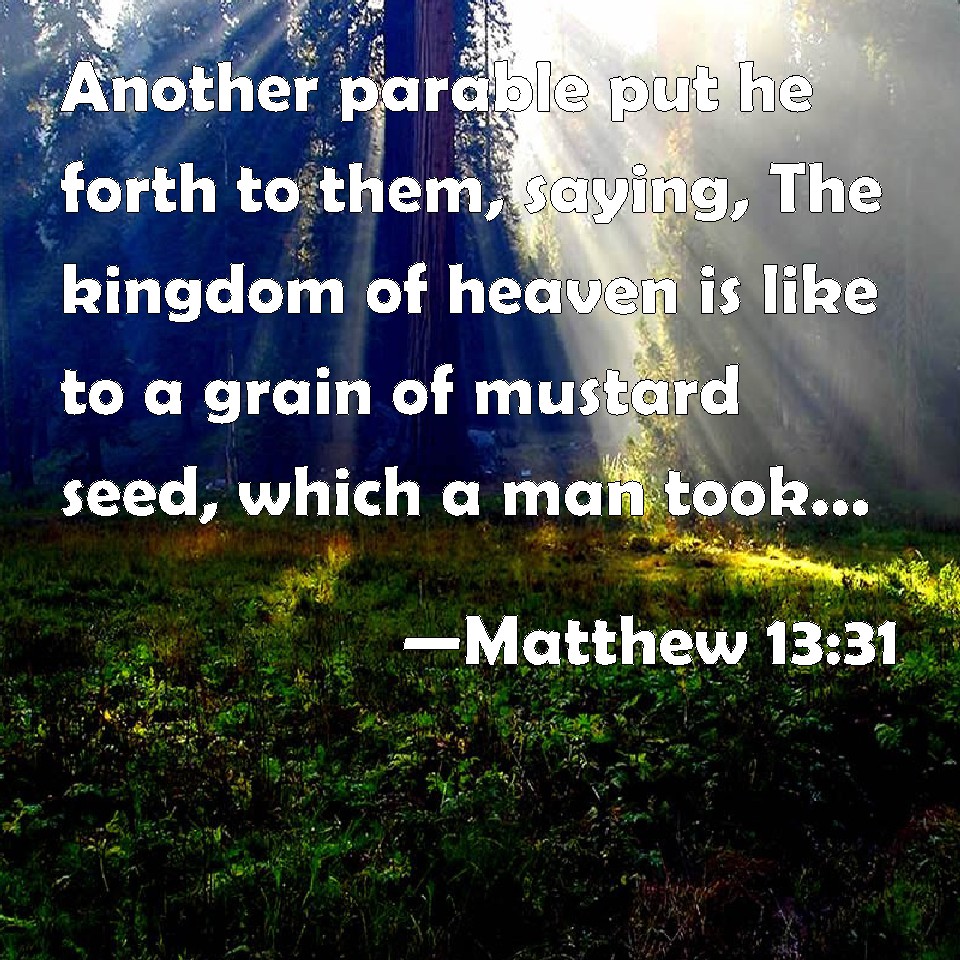 Choose a Background Matthew 13:31 Another parable put he forth to them, saying, The kingdom of heaven is like to a grain of mustard seed, which a man took, and sowed in his field: KJV: Another parable put he forth unto them, saying, The kingdom of heaven is like to a grain of mustard seed, which a man took, and sowed in his field: DRB: Another parable he proposed unto them, saying: The kingdom of heaven is like to a grain of mustard seed, which a man took and sowed in his field. DBT: Another parable set he before them, saying, The kingdom of the heavens is like a grain of mustard seed which a man took and sowed in his field; ERV: Another parable set he before them, saying, The kingdom of heaven is like unto a grain of mustard seed, which a man took, and sowed in his field: WBT: Another parable he proposed to them, saying, The kingdom of heaven is like a grain of mustard-seed, which a man took, and sowed in his field: WEB: He set another parable before them, saying, "The Kingdom of Heaven is like a grain of mustard seed, which a man took, and sowed in his field; YLT: Another simile he set before them, saying: 'The reign of the heavens is like to a grain of mustard, which a man having taken, did sow in his field,Links Matthew 13:31 NIV • Matthew 13:31 NLT • Matthew 13:31 ESV • Matthew 13:31 NASB • Matthew 13:31 KJV • Matthew 13:31 Interlinear • Matthew 13:31 Commentaries • Matthew 13:31 Parallel Texts • Matthew 13:31 Bible Apps • Matthew 13:31 Parallel • Bible Hub |