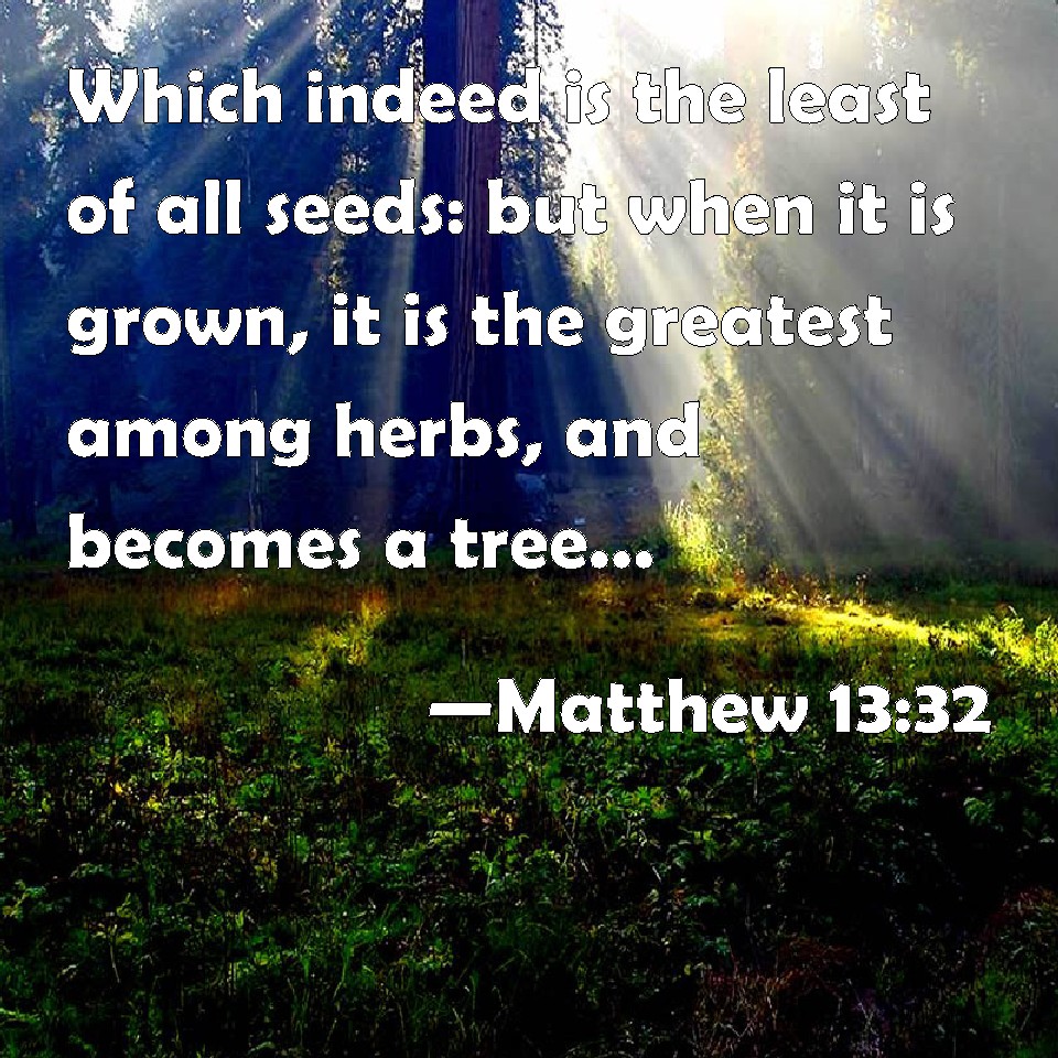 Choose a Background Matthew 13:32 Which indeed is the least of all seeds: but when it is grown, it is the greatest among herbs, and becomes a tree, so that the birds of the air come and lodge in the branches thereof. KJV: Which indeed is the least of all seeds: but when it is grown, it is the greatest among herbs, and becometh a tree, so that the birds of the air come and lodge in the branches thereof. DRB: Which is the least indeed of all seeds; but when it is grown up, it is greater than all herbs, and becometh a tree, so that the birds of the air come, and dwell in the branches thereof. DBT: which is less indeed than all seeds, but when it is grown is greater than herbs, and becomes a tree, so that the birds of heaven come and roost in its branches. ERV: which indeed is less than all seeds; but when it is grown, it is greater than the herbs, and becometh a tree, so that the birds of the heaven come and lodge in the branches thereof. WBT: Which indeed is the least of all seeds: but when it is grown, it is the greatest among herbs, and becometh a tree, so that the birds of the air come and lodge on its branches. WEB: which indeed is smaller than all seeds. But when it is grown, it is greater than the herbs, and becomes a tree, so that the birds of the air come and lodge in its branches." YLT: which less, indeed, is than all the seeds, but when it may be grown, is greatest of the herbs, and becometh a tree, so that the birds of the heaven do come and rest in its branches.'Links Matthew 13:32 NIV • Matthew 13:32 NLT • Matthew 13:32 ESV • Matthew 13:32 NASB • Matthew 13:32 KJV • Matthew 13:32 Interlinear • Matthew 13:32 Commentaries • Matthew 13:32 Parallel Texts • Matthew 13:32 Bible Apps • Matthew 13:32 Parallel • Bible Hub |
