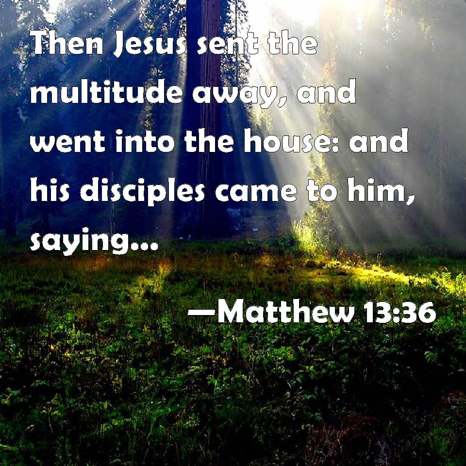 Choose a Background Matthew 13:36 Then Jesus sent the multitude away, and went into the house: and his disciples came to him, saying, Declare to us the parable of the tares of the field. KJV: Then Jesus sent the multitude away, and went into the house: and his disciples came unto him, saying, Declare unto us the parable of the tares of the field. DRB: Then having sent away the multitudes, he came into the house, and his disciples came to him, saying: Expound to us the parable of the cockle of the field. DBT: Then, having dismissed the crowds, he went into the house; and his disciples came to him, saying, Expound to us the parable of the darnel of the field. ERV: Then he left the multitudes, and went into the house: and his disciples came unto him, saying, Explain unto us the parable of the tares of the field. WBT: Then Jesus sent the multitude away, and went into the house: and his disciples came to him, saying, Declare to us the parable of the tares of the field. WEB: Then Jesus sent the multitudes away, and went into the house. His disciples came to him, saying, "Explain to us the parable of the darnel weeds of the field." YLT: Then having let away the multitudes, Jesus came to the house, and his disciples came near to him, saying, 'Explain to us the simile of the darnel of the field.'Links Matthew 13:36 NIV • Matthew 13:36 NLT • Matthew 13:36 ESV • Matthew 13:36 NASB • Matthew 13:36 KJV • Matthew 13:36 Interlinear • Matthew 13:36 Commentaries • Matthew 13:36 Parallel Texts • Matthew 13:36 Bible Apps • Matthew 13:36 Parallel • Bible Hub |
