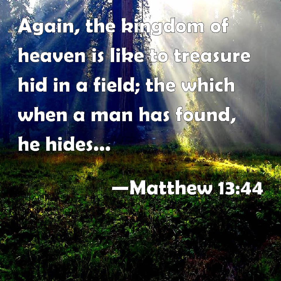 Choose a Background Matthew 13:44 Again, the kingdom of heaven is like to treasure hid in a field; the which when a man has found, he hides, and for joy thereof goes and sells all that he has, and buys that field. KJV: Again, the kingdom of heaven is like unto treasure hid in a field; the which when a man hath found, he hideth, and for joy thereof goeth and selleth all that he hath, and buyeth that field. DRB: The kingdom of heaven is like unto a treasure hidden in a field. Which a man having found, hid it, and for joy thereof goeth, and selleth all that he hath, and buyeth that field. DBT: The kingdom of the heavens is like a treasure hid in the field, which a man having found has hid, and for the joy of it goes and sells all whatever he has, and buys that field. ERV: The kingdom of heaven is like unto a treasure hidden in the field; which a man found, and hid; and in his joy he goeth and selleth all that he hath, and buyeth that field. WBT: Again, the kingdom of heaven is like treasure hid in a field; which, when a man hath found, he hideth, and for joy thereof goeth and selleth all that he hath, and buyeth that field. WEB: "Again, the Kingdom of Heaven is like a treasure hidden in the field, which a man found, and hid. In his joy, he goes and sells all that he has, and buys that field. YLT: 'Again, the reign of the heavens is like to treasure hid in the field, which a man having found did hide, and from his joy goeth, and all, as much as he hath, he selleth, and buyeth that field.Links Matthew 13:44 NIV • Matthew 13:44 NLT • Matthew 13:44 ESV • Matthew 13:44 NASB • Matthew 13:44 KJV • Matthew 13:44 Interlinear • Matthew 13:44 Commentaries • Matthew 13:44 Parallel Texts • Matthew 13:44 Bible Apps • Matthew 13:44 Parallel • Bible Hub |