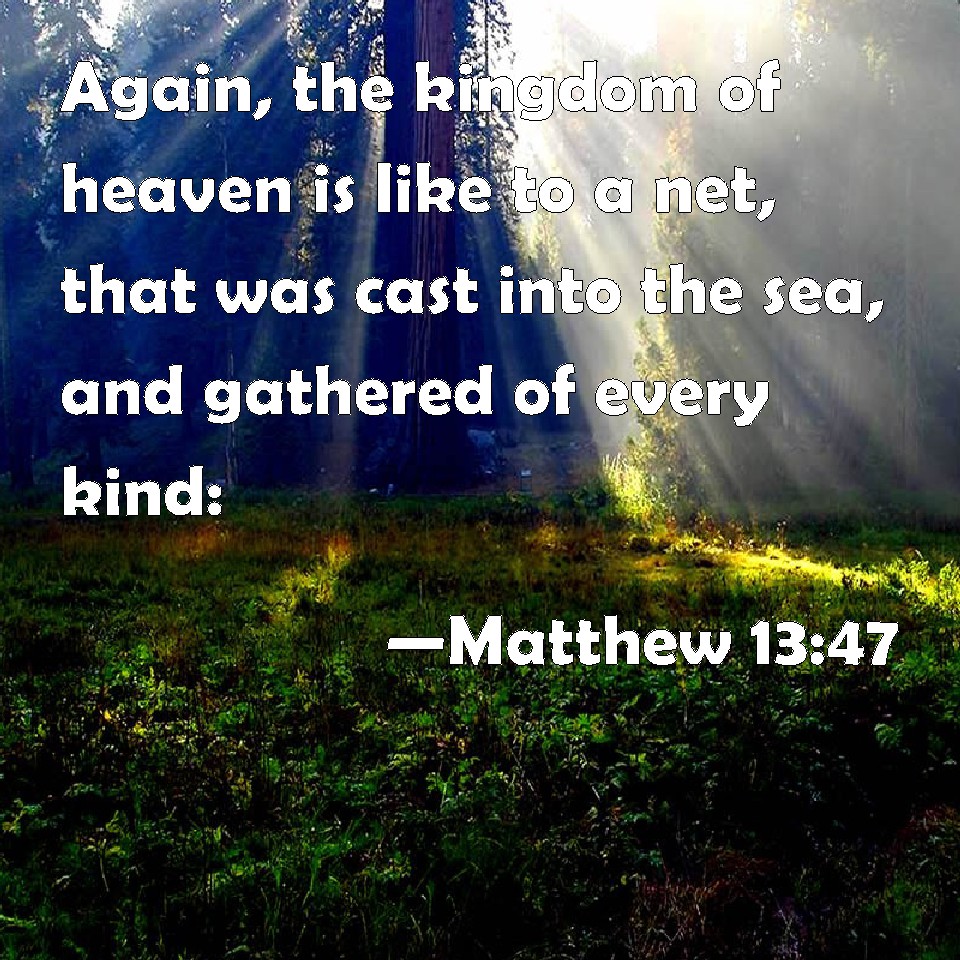 Choose a Background Matthew 13:47 Again, the kingdom of heaven is like to a net, that was cast into the sea, and gathered of every kind: KJV: Again, the kingdom of heaven is like unto a net, that was cast into the sea, and gathered of every kind: DRB: Again the kingdom of heaven is like to a net cast into the sea, and gathering together of all kind of fishes. DBT: Again, the kingdom of the heavens is like a seine which has been cast into the sea, and which has gathered together of every kind, ERV: Again, the kingdom of heaven is like unto a net, that was cast into the sea, and gathered of every kind: WBT: Again, the kingdom of heaven is like a net, that was cast into the sea, and gathered of every kind: WEB: "Again, the Kingdom of Heaven is like a dragnet, that was cast into the sea, and gathered some fish of every kind, YLT: 'Again, the reign of the heavens is like to a net that was cast into the sea, and did gather together of every kind,Links Matthew 13:47 NIV • Matthew 13:47 NLT • Matthew 13:47 ESV • Matthew 13:47 NASB • Matthew 13:47 KJV • Matthew 13:47 Interlinear • Matthew 13:47 Commentaries • Matthew 13:47 Parallel Texts • Matthew 13:47 Bible Apps • Matthew 13:47 Parallel • Bible Hub |