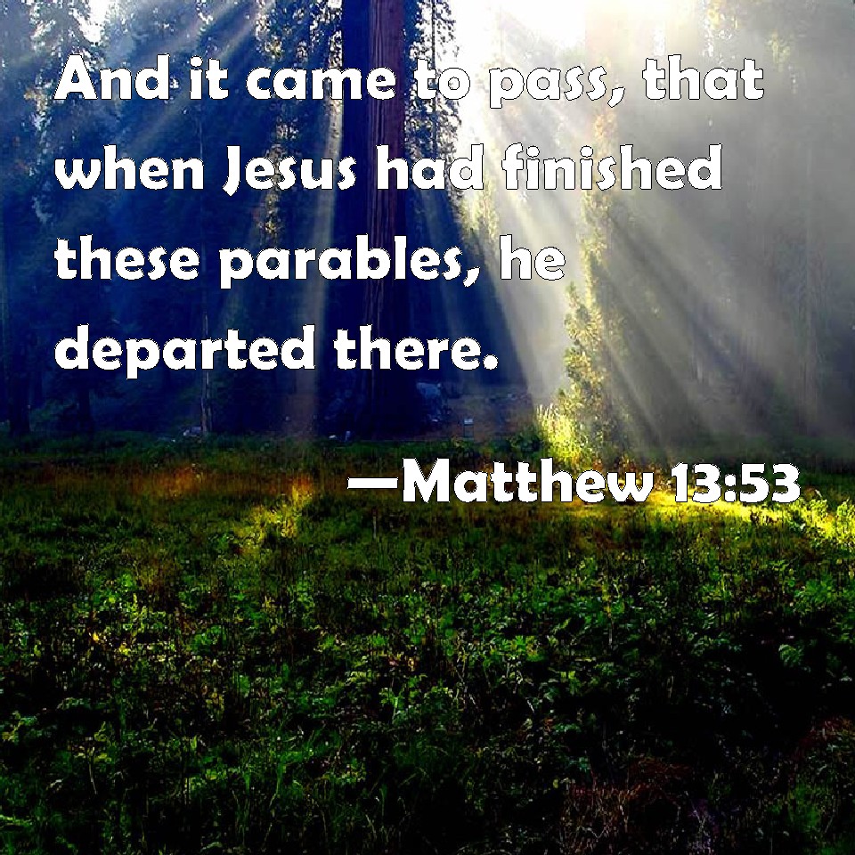 Choose a Background Matthew 13:53 And it came to pass, that when Jesus had finished these parables, he departed there. KJV: And it came to pass, that when Jesus had finished these parables, he departed thence. DRB: And it came to pass: when Jesus had finished these parables, he passed from thence. DBT: And it came to pass when Jesus had finished these parables he withdrew thence. ERV: And it came to pass, when Jesus had finished these parables, he departed thence. WBT: And it came to pass, that when Jesus had finished these parables, he departed thence. WEB: It happened that when Jesus had finished these parables, he departed from there. YLT: And it came to pass, when Jesus finished these similes, he removed thence,Links Matthew 13:53 NIV • Matthew 13:53 NLT • Matthew 13:53 ESV • Matthew 13:53 NASB • Matthew 13:53 KJV • Matthew 13:53 Interlinear • Matthew 13:53 Commentaries • Matthew 13:53 Parallel Texts • Matthew 13:53 Bible Apps • Matthew 13:53 Parallel • Bible Hub |