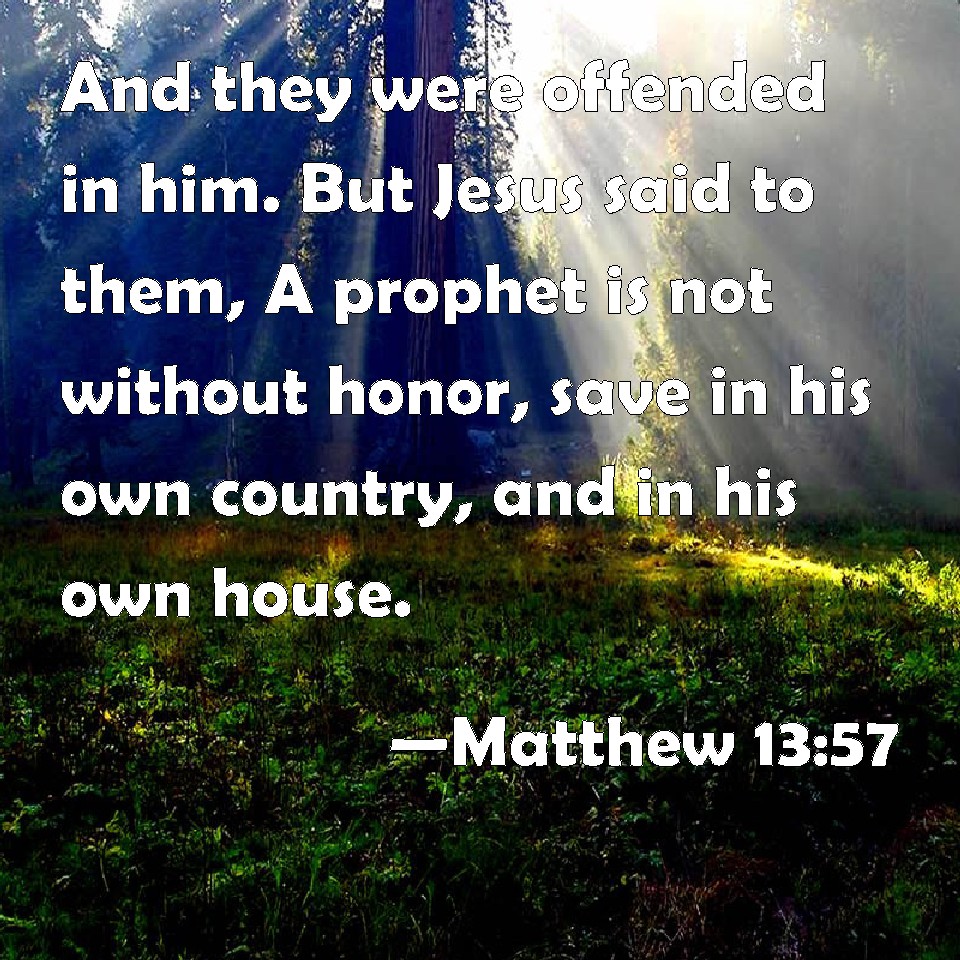 Choose a Background Matthew 13:57 And they were offended in him. But Jesus said to them, A prophet is not without honor, save in his own country, and in his own house. KJV: And they were offended in him. But Jesus said unto them, A prophet is not without honour, save in his own country, and in his own house. DRB: And they were scandalized in his regard. But Jesus said to them: A prophet is not without honour, save in his own country, and in his own house. DBT: And they were offended in him. And Jesus said to them, A prophet is not without honour, unless in his country and in his house. ERV: And they were offended in him. But Jesus said unto them, A prophet is not without honour, save in his own country, and in his own house. WBT: And they were offended in him. But Jesus said to them, A prophet is not without honor, save in his own country, and in his own house. WEB: They were offended by him. But Jesus said to them, "A prophet is not without honor, except in his own country, and in his own house." YLT: and they were stumbled at him. And Jesus said to them, 'A prophet is not without honour except in his own country, and in his own house:'Links Matthew 13:57 NIV • Matthew 13:57 NLT • Matthew 13:57 ESV • Matthew 13:57 NASB • Matthew 13:57 KJV • Matthew 13:57 Interlinear • Matthew 13:57 Commentaries • Matthew 13:57 Parallel Texts • Matthew 13:57 Bible Apps • Matthew 13:57 Parallel • Bible Hub |
