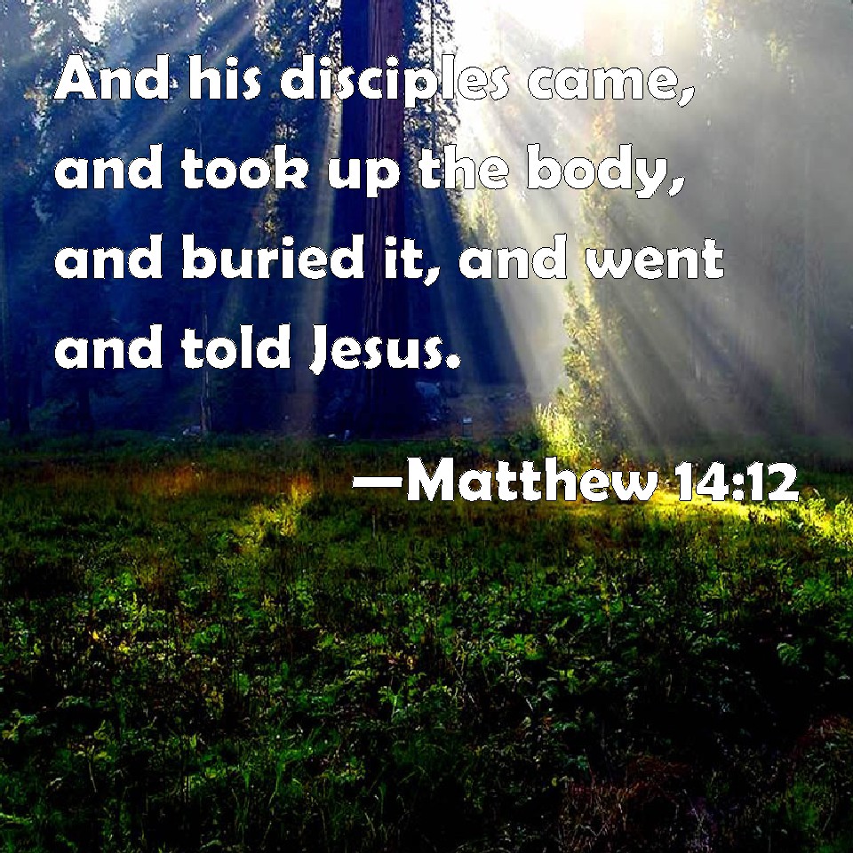 Choose a Background Matthew 14:12 And his disciples came, and took up the body, and buried it, and went and told Jesus. KJV: And his disciples came, and took up the body, and buried it, and went and told Jesus. DRB: And his disciples came and took the body, and buried it, and came and told Jesus. DBT: And his disciples came and took the body and buried it, and came and brought word to Jesus. ERV: And his disciples came, and took up the corpse, and buried him; and they went and told Jesus. WBT: And his disciples came, and took up the body, and buried it, and went and told Jesus. WEB: His disciples came, and took the body, and buried it; and they went and told Jesus. YLT: And his disciples having come, took up the body, and buried it, and having come, they told Jesus,Links Matthew 14:12 NIV • Matthew 14:12 NLT • Matthew 14:12 ESV • Matthew 14:12 NASB • Matthew 14:12 KJV • Matthew 14:12 Interlinear • Matthew 14:12 Commentaries • Matthew 14:12 Parallel Texts • Matthew 14:12 Bible Apps • Matthew 14:12 Parallel • Bible Hub |