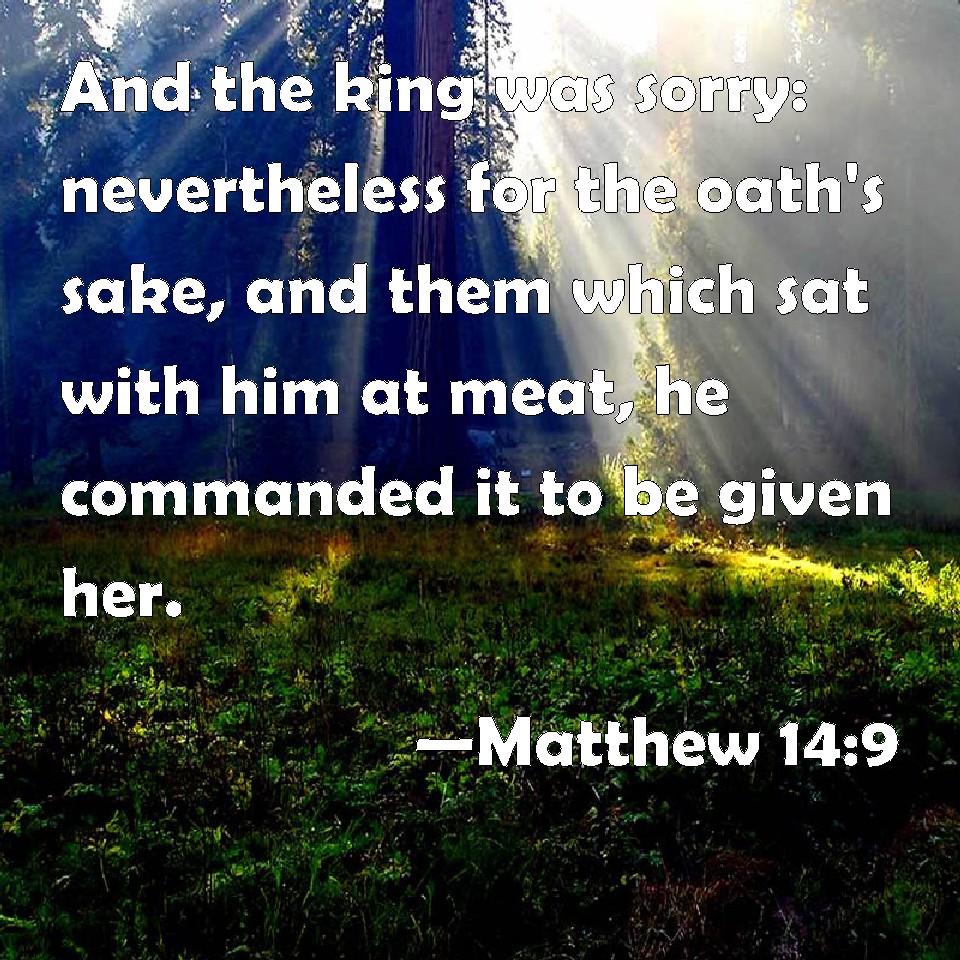 Choose a Background Matthew 14:9 And the king was sorry: nevertheless for the oath's sake, and them which sat with him at meat, he commanded it to be given her. KJV: And the king was sorry: nevertheless for the oath's sake, and them which sat with him at meat, he commanded it to be given her. DRB: And the king was struck sad: yet because of his oath, and for them that sat with him at table, he commanded it to be given. DBT: And the king was grieved; but on account of the oaths, and those lying at table with him, he commanded it to be given. ERV: And the king was grieved; but for the sake of his oaths, and of them which sat at meat with him, he commanded it to be given; WBT: And the king was sorry: nevertheless for the sake of the oath, and of them who sat with him at table, he commanded it to be given her. WEB: The king was grieved, but for the sake of his oaths, and of those who sat at the table with him, he commanded it to be given, YLT: and the king was grieved, but because of the oaths and of those reclining with him, he commanded it to be given;Links Matthew 14:9 NIV • Matthew 14:9 NLT • Matthew 14:9 ESV • Matthew 14:9 NASB • Matthew 14:9 KJV • Matthew 14:9 Interlinear • Matthew 14:9 Commentaries • Matthew 14:9 Parallel Texts • Matthew 14:9 Bible Apps • Matthew 14:9 Parallel • Bible Hub |