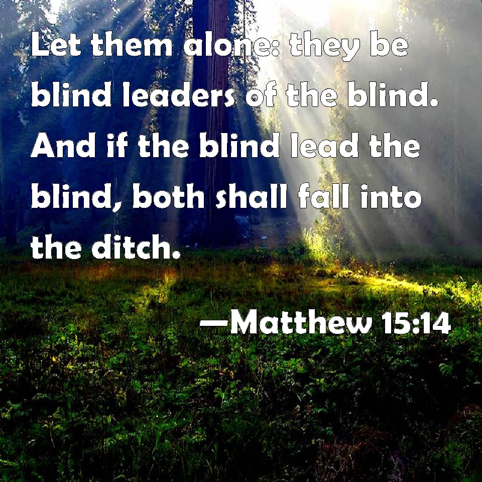 Choose a Background Matthew 15:14 Let them alone: they be blind leaders of the blind. And if the blind lead the blind, both shall fall into the ditch. KJV: Let them alone: they be blind leaders of the blind. And if the blind lead the blind, both shall fall into the ditch. DRB: Let them alone: they are blind, and leaders of the blind. And if the blind lead the blind, both will fall into the pit. DBT: Leave them alone; they are blind leaders of blind: but if blind lead blind, both will fall into a ditch. ERV: Let them alone: they are blind guides. And if the blind guide the blind, both shall fall into a pit. WBT: Let them alone: they are blind leaders of the blind. And if the blind leadeth the blind, both will fall into the ditch. WEB: Leave them alone. They are blind guides of the blind. If the blind guide the blind, both will fall into a pit." YLT: let them alone, guides they are — blind of blind; and if blind may guide blind, both into a ditch shall fall.'Links Matthew 15:14 NIV • Matthew 15:14 NLT • Matthew 15:14 ESV • Matthew 15:14 NASB • Matthew 15:14 KJV • Matthew 15:14 Interlinear • Matthew 15:14 Commentaries • Matthew 15:14 Parallel Texts • Matthew 15:14 Bible Apps • Matthew 15:14 Parallel • Bible Hub |