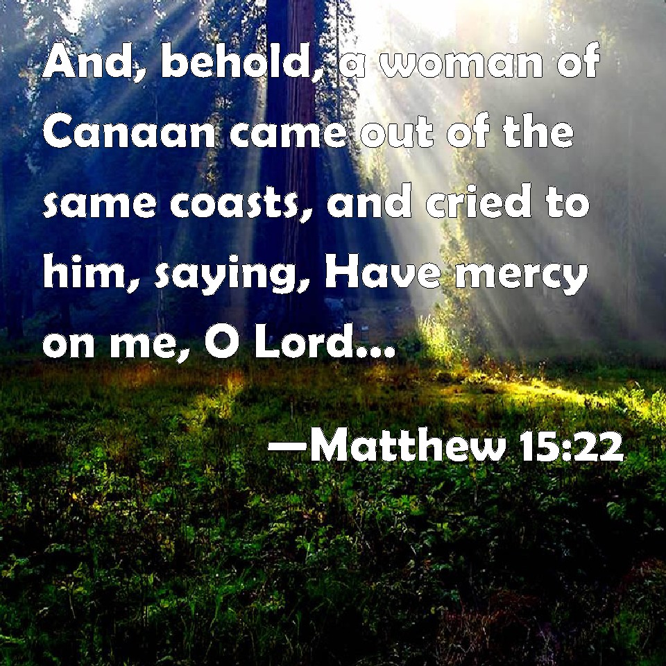 Choose a Background Matthew 15:22 And, behold, a woman of Canaan came out of the same coasts, and cried to him, saying, Have mercy on me, O Lord, you son of David; my daughter is grievously vexed with a devil. KJV: And, behold, a woman of Canaan came out of the same coasts, and cried unto him, saying, Have mercy on me, O Lord, thou Son of David; my daughter is grievously vexed with a devil. DRB: And behold a woman of Canaan who came out of those coasts, crying out, said to him: Have mercy on me, O Lord, thou son of David: my daughter is grieviously troubled by the devil. DBT: and lo, a Canaanitish woman, coming out from those borders, cried to him saying, Have pity on me, Lord, Son of David; my daughter is miserably possessed by a demon. ERV: And behold, a Canaanitish woman came out from those borders, and cried, saying, Have mercy on me, O Lord, thou son of David; my daughter is grievously vexed with a devil. WBT: And behold, a woman of Canaan came out of the same territories, and cried to him, saying, Have mercy on me, O Lord, thou son of David; my daughter is grievously afflicted with a demon. WEB: Behold, a Canaanite woman came out from those borders, and cried, saying, "Have mercy on me, Lord, you son of David! My daughter is severely demonized!" YLT: and lo, a woman, a Canaanitess, from those borders having come forth, did call to him, saying, 'Deal kindly with me, Sir — Son of David; my daughter is miserably demonized.'Links Matthew 15:22 NIV • Matthew 15:22 NLT • Matthew 15:22 ESV • Matthew 15:22 NASB • Matthew 15:22 KJV • Matthew 15:22 Interlinear • Matthew 15:22 Commentaries • Matthew 15:22 Parallel Texts • Matthew 15:22 Bible Apps • Matthew 15:22 Parallel • Bible Hub |