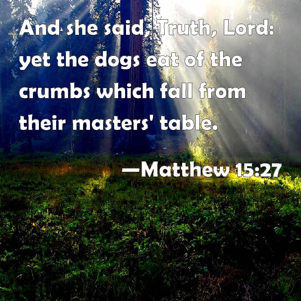 Choose a Background Matthew 15:27 And she said, Truth, Lord: yet the dogs eat of the crumbs which fall from their masters' table. KJV: And she said, Truth, Lord: yet the dogs eat of the crumbs which fall from their masters' table. DRB: But she said: Yea, Lord; for the whelps also eat of the crumbs that fall from the table of their masters. DBT: But she said, Yea, Lord; for even the dogs eat of the crumbs which fall from the table of their masters. ERV: But she said, Yea, Lord: for even the dogs eat of the crumbs which fall from their masters' table. WBT: And she said, Truth, Lord: yet the dogs eat of the crums which fall from their master's table. WEB: But she said, "Yes, Lord, but even the dogs eat the crumbs which fall from their masters' table." YLT: And she said, 'Yes, sir, for even the little dogs do eat of the crumbs that are falling from their lords' table;'Links Matthew 15:27 NIV • Matthew 15:27 NLT • Matthew 15:27 ESV • Matthew 15:27 NASB • Matthew 15:27 KJV • Matthew 15:27 Interlinear • Matthew 15:27 Commentaries • Matthew 15:27 Parallel Texts • Matthew 15:27 Bible Apps • Matthew 15:27 Parallel • Bible Hub |
