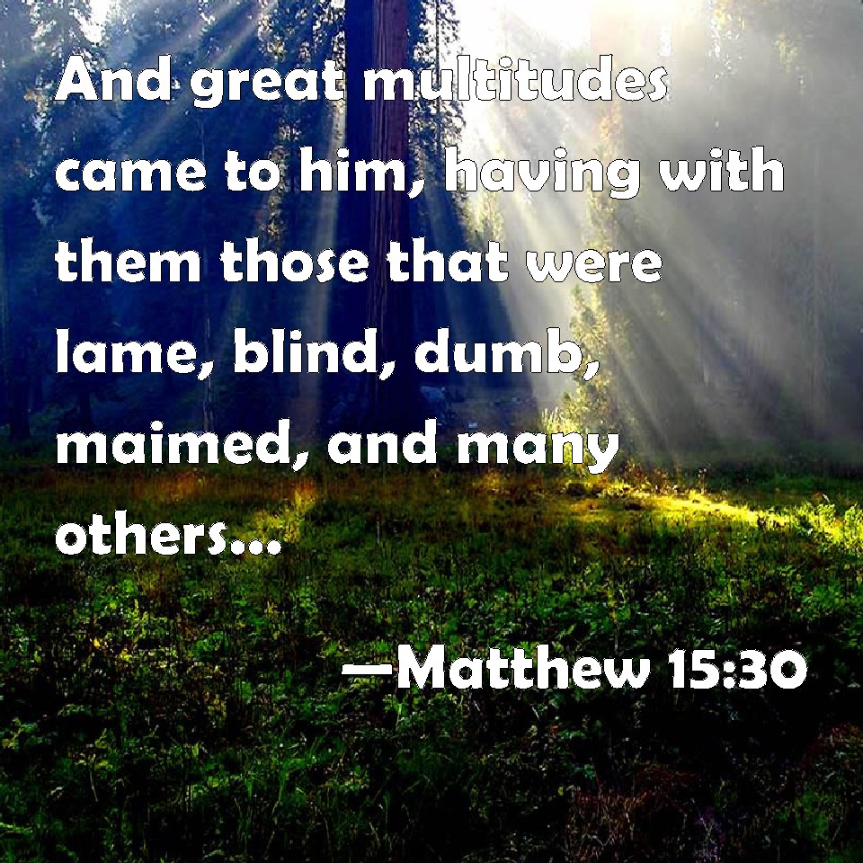 Choose a Background Matthew 15:30 And great multitudes came to him, having with them those that were lame, blind, dumb, maimed, and many others, and cast them down at Jesus' feet; and he healed them: KJV: And great multitudes came unto him, having with them those that were lame, blind, dumb, maimed, and many others, and cast them down at Jesus' feet; and he healed them: DRB: And there came to him great multitudes, having with them the dumb, the blind, the lame, the maimed, and many others: and they cast them down at his feet, and he healed them: DBT: and great crowds came to him, having with them lame, blind, dumb, crippled, and many others, and they cast them at his feet, and he healed them: ERV: And there came unto him great multitudes, having with them the lame, blind, dumb, maimed, and many others, and they cast them down at his feet; and he healed them: WBT: And great multitudes came to him, having with them those that were lame, blind, dumb, maimed, and many others, and cast them down at Jesus' feet; and he healed them: WEB: Great multitudes came to him, having with them the lame, blind, mute, maimed, and many others, and they put them down at his feet. He healed them, YLT: and there came to him great multitudes, having with them lame, blind, dumb, maimed, and many others, and they did cast them at the feet of Jesus, and he healed them,Links Matthew 15:30 NIV • Matthew 15:30 NLT • Matthew 15:30 ESV • Matthew 15:30 NASB • Matthew 15:30 KJV • Matthew 15:30 Interlinear • Matthew 15:30 Commentaries • Matthew 15:30 Parallel Texts • Matthew 15:30 Bible Apps • Matthew 15:30 Parallel • Bible Hub |