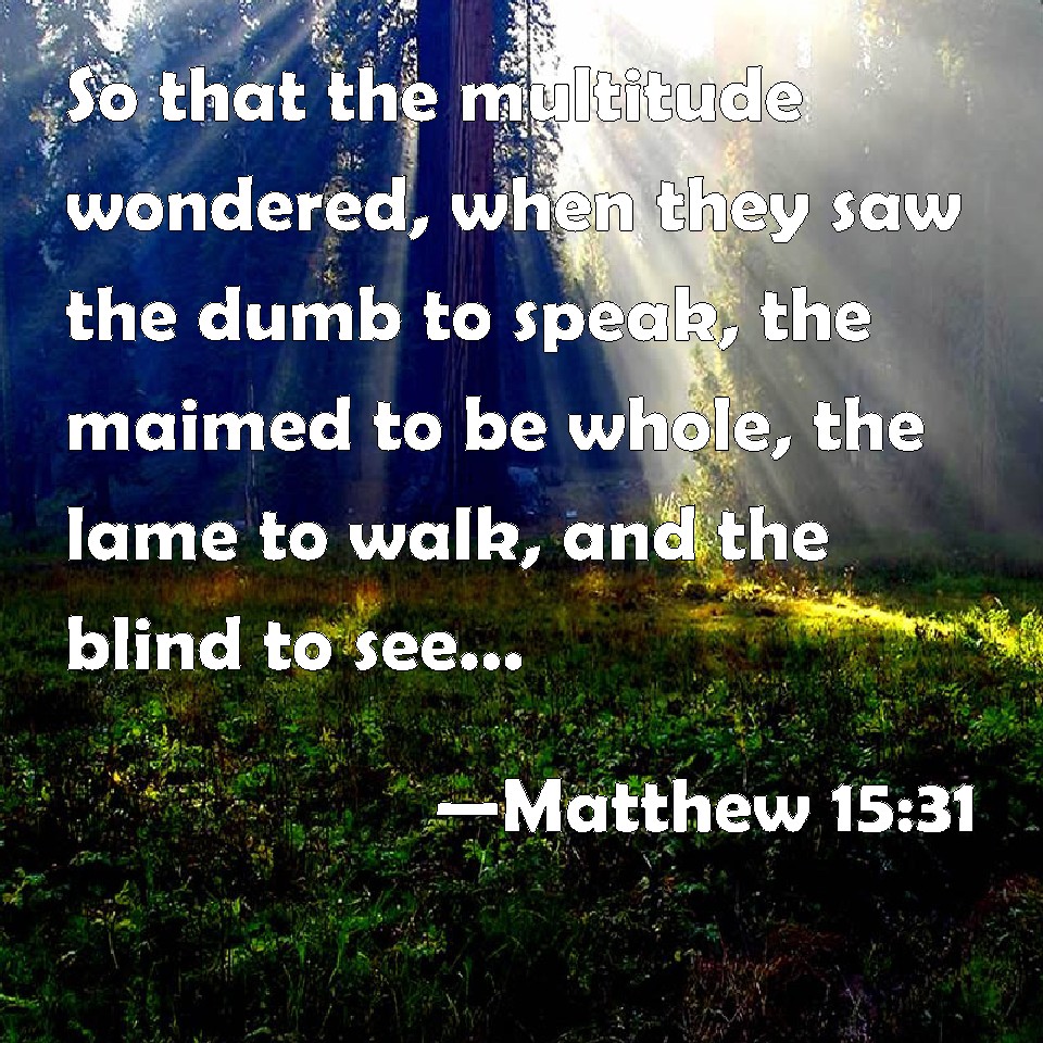 Choose a Background Matthew 15:31 So that the multitude wondered, when they saw the dumb to speak, the maimed to be whole, the lame to walk, and the blind to see: and they glorified the God of Israel. KJV: Insomuch that the multitude wondered, when they saw the dumb to speak, the maimed to be whole, the lame to walk, and the blind to see: and they glorified the God of Israel. DRB: So that the multitudes marvelled seeing the dumb speak, the lame walk, and the blind see: and they glorified the God of Israel. DBT: so that the crowds wondered, seeing dumb speaking, crippled sound, lame walking, and blind seeing; and they glorified the God of Israel. ERV: insomuch that the multitude wondered, when they saw the dumb speaking, the maimed whole, and the lame walking, and the blind seeing: and they glorified the God of Israel. WBT: So that the multitude wondered, when they saw the dumb to speak, the maimed to be whole, the lame to walk, and the blind to see: and they glorified the God of Israel. WEB: so that the multitude wondered when they saw the mute speaking, injured whole, lame walking, and blind seeing—and they glorified the God of Israel. YLT: so that the multitudes did wonder, seeing dumb ones speaking, maimed whole, lame walking, and blind seeing; and they glorified the God of Israel.Links Matthew 15:31 NIV • Matthew 15:31 NLT • Matthew 15:31 ESV • Matthew 15:31 NASB • Matthew 15:31 KJV • Matthew 15:31 Interlinear • Matthew 15:31 Commentaries • Matthew 15:31 Parallel Texts • Matthew 15:31 Bible Apps • Matthew 15:31 Parallel • Bible Hub |