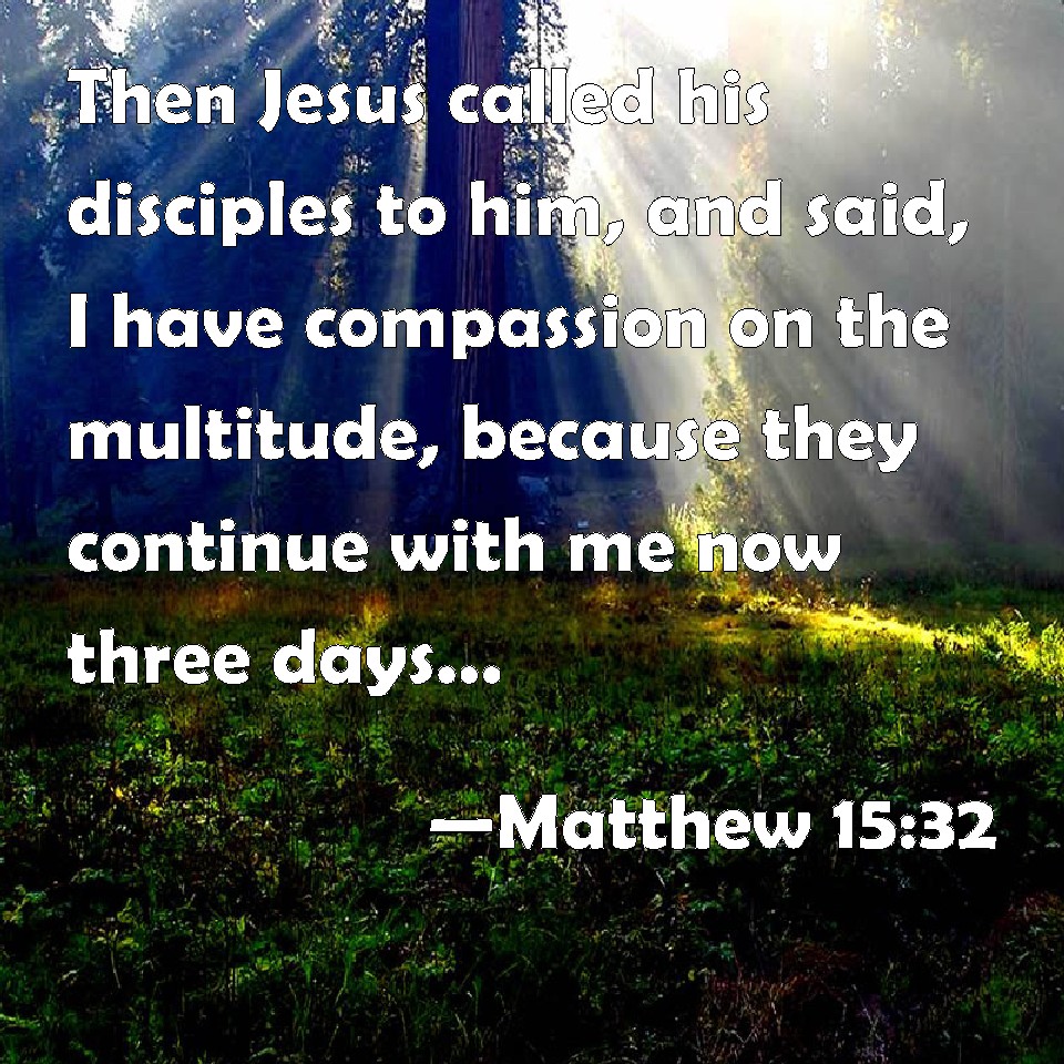 Choose a Background Matthew 15:32 Then Jesus called his disciples to him, and said, I have compassion on the multitude, because they continue with me now three days, and have nothing to eat: and I will not send them away fasting, lest they faint in the way. KJV: Then Jesus called his disciples unto him, and said, I have compassion on the multitude, because they continue with me now three days, and have nothing to eat: and I will not send them away fasting, lest they faint in the way. DRB: And Jesus called together his disciples, and said: I have compassion on the multitudes, because they continue with me now three days, and have not what to eat, and I will not send them away fasting, lest they faint in the way. DBT: But Jesus, having called his disciples to him, said, I have compassion on the crowd, because they have stayed with me already three days and they have not anything they can eat, and I would not send them away fasting lest they should faint on the way. ERV: And Jesus called unto him his disciples, and said, I have compassion on the multitude, because they continue with me now three days and have nothing to eat: and I would not send them away fasting, lest haply they faint in the way. WBT: Then Jesus called his disciples to him, and said, I have compassion on the multitude, because they continue with me now three days, and have nothing to eat: and I will not send them away fasting, lest they faint in the way. WEB: Jesus summoned his disciples and said, "I have compassion on the multitude, because they continue with me now three days and have nothing to eat. I don't want to send them away fasting, or they might faint on the way." YLT: And Jesus having called near his disciples, said, 'I have compassion upon the multitude, because now three days they continue with me, and they have not what they may eat; and to let them away fasting I will not, lest they faint in the way.'Links Matthew 15:32 NIV • Matthew 15:32 NLT • Matthew 15:32 ESV • Matthew 15:32 NASB • Matthew 15:32 KJV • Matthew 15:32 Interlinear • Matthew 15:32 Commentaries • Matthew 15:32 Parallel Texts • Matthew 15:32 Bible Apps • Matthew 15:32 Parallel • Bible Hub |
