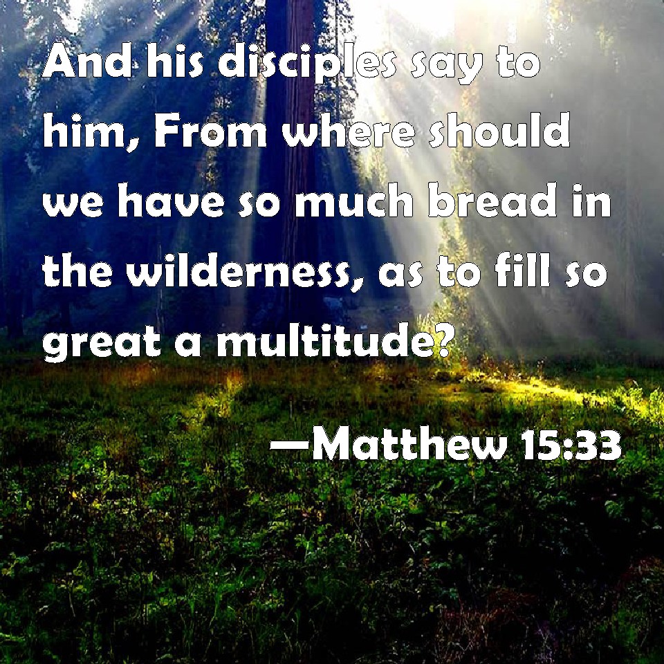 Choose a Background Matthew 15:33 And his disciples say to him, From where should we have so much bread in the wilderness, as to fill so great a multitude? KJV: And his disciples say unto him, Whence should we have so much bread in the wilderness, as to fill so great a multitude? DRB: And the disciples say unto him: Whence then should we have so many loaves in the desert, as to fill so great a multitude? DBT: And his disciples say to him, Whence should we have so many loaves in the wilderness as to satisfy so great a crowd? ERV: And the disciples say unto him, Whence should we have so many loaves in a desert place, as to fill so great a multitude? WBT: And his disciples say to him, Whence should we have so much bread in the wilderness, as to satisfy so great a multitude? WEB: The disciples said to him, "Where should we get so many loaves in a deserted place as to satisfy so great a multitude?" YLT: And his disciples say to him, 'Whence to us, in a wilderness, so many loaves, as to fill so great a multitude?'Links Matthew 15:33 NIV • Matthew 15:33 NLT • Matthew 15:33 ESV • Matthew 15:33 NASB • Matthew 15:33 KJV • Matthew 15:33 Interlinear • Matthew 15:33 Commentaries • Matthew 15:33 Parallel Texts • Matthew 15:33 Bible Apps • Matthew 15:33 Parallel • Bible Hub |