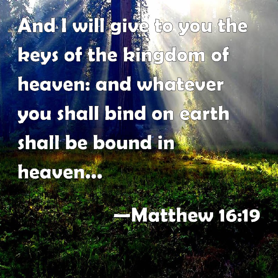 And I will give unto thee the keys of the kingdom of heaven: and whatsoever thou shalt bind on earth shall be bound in heaven: and whatsoever thou shalt loose on earth shall be loosed in heaven.