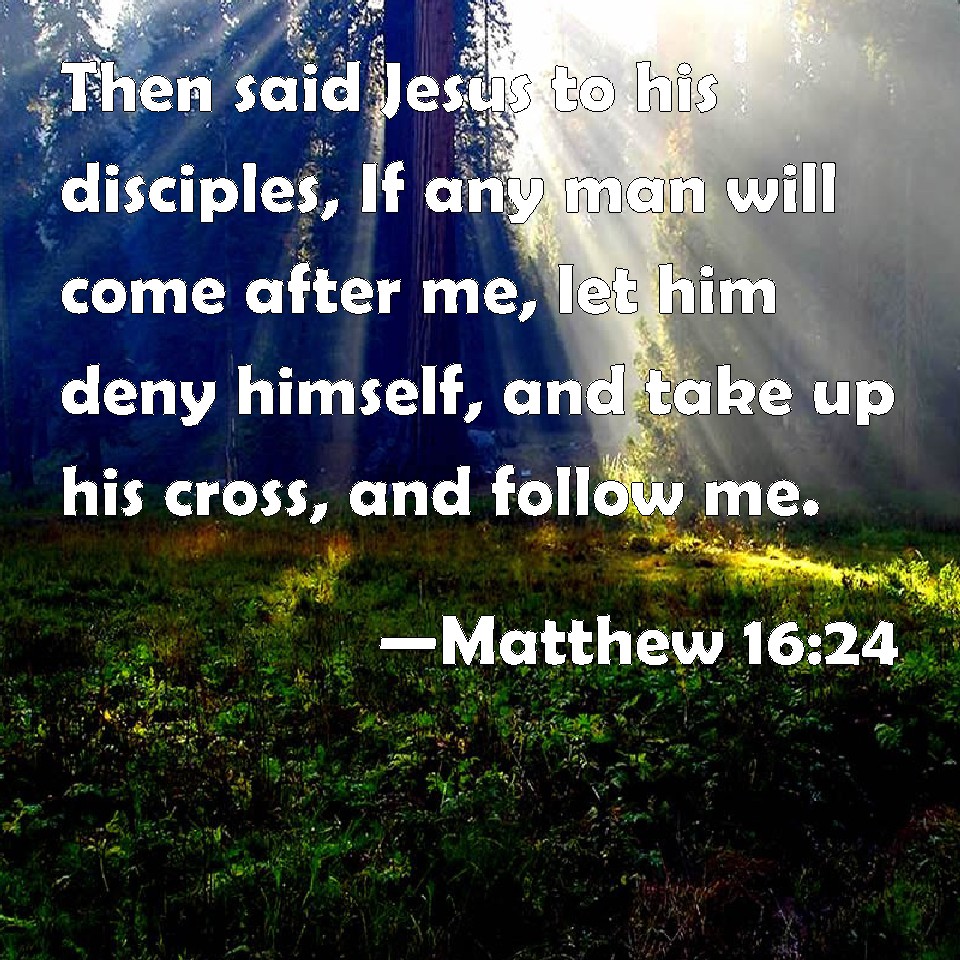 Choose a Background Matthew 16:24 Then said Jesus to his disciples, If any man will come after me, let him deny himself, and take up his cross, and follow me. KJV: Then said Jesus unto his disciples, If any man will come after me, let him deny himself, and take up his cross, and follow me. DRB: Then Jesus said to his disciples: If any man will come after me, let him deny himself, and take up his cross, and follow me. DBT: Then Jesus said to his disciples, If any one desires to come after me, let him deny himself and take up his cross and follow me. ERV: Then said Jesus unto his disciples, If any man would come after me, let him deny himself, and take up his cross, and follow me. WBT: Then said Jesus to his disciples, If any man will come after me, let him deny himself, and take up his cross, and follow me. WEB: Then Jesus said to his disciples, "If anyone desires to come after me, let him deny himself, and take up his cross, and follow me. YLT: Then said Jesus to his disciples, 'If any one doth will to come after me, let him disown himself, and take up his cross, and follow me,Links Matthew 16:24 NIV • Matthew 16:24 NLT • Matthew 16:24 ESV • Matthew 16:24 NASB • Matthew 16:24 KJV • Matthew 16:24 Interlinear • Matthew 16:24 Commentaries • Matthew 16:24 Parallel Texts • Matthew 16:24 Bible Apps • Matthew 16:24 Parallel • Bible Hub |