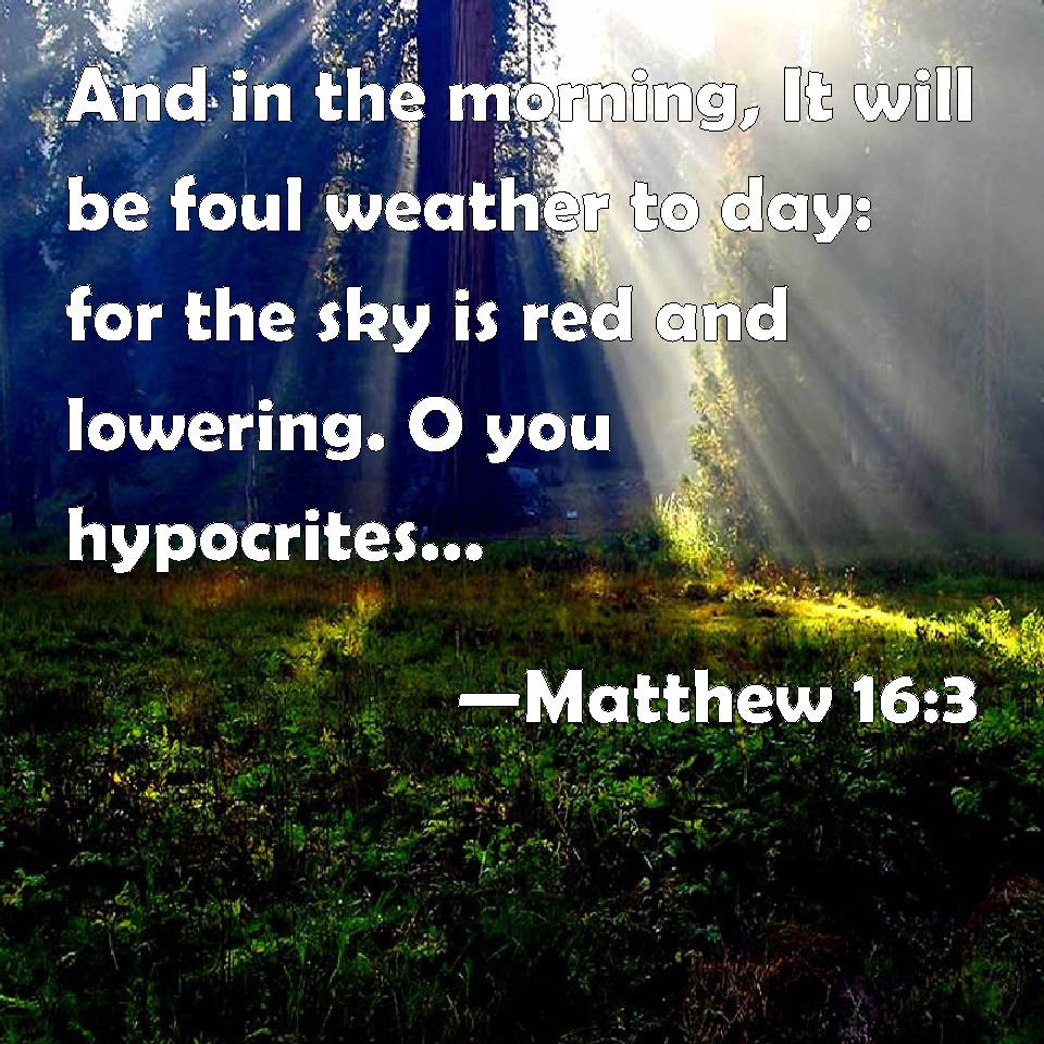 Choose a Background Matthew 16:3 And in the morning, It will be foul weather to day: for the sky is red and lowering. O you hypocrites, you can discern the face of the sky; but can you not discern the signs of the times? KJV: And in the morning, It will be foul weather to day: for the sky is red and lowring. O ye hypocrites, ye can discern the face of the sky; but can ye not discern the signs of the times? DRB: And in the morning: To day there will be a storm, for the sky is red and lowering. You know then how to discern the face of the sky: and can you not know the signs of the times? DBT: and in the morning, A storm to-day, for the sky is red and lowering; ye know how to discern the face of the sky, but ye cannot the signs of the times. ERV: And in the morning, It will be foul weather today: for the heaven is red and lowring. Ye know how to discern the face of the heaven; but ye cannot discern the signs of the times. WBT: And in the morning, It will be foul weather to-day: for the sky is red and lowering. O ye hypocrites, ye can discern the face of the sky; but can ye not discern the signs of the times? WEB: In the morning, 'It will be foul weather today, for the sky is red and threatening.' Hypocrites! You know how to discern the appearance of the sky, but you can't discern the signs of the times! YLT: and at morning, Foul weather to-day, for the heaven is red — gloomy; hypocrites, the face of the heavens indeed ye do know to discern, but the signs of the times ye are not able!Links Matthew 16:3 NIV • Matthew 16:3 NLT • Matthew 16:3 ESV • Matthew 16:3 NASB • Matthew 16:3 KJV • Matthew 16:3 Interlinear • Matthew 16:3 Commentaries • Matthew 16:3 Parallel Texts • Matthew 16:3 Bible Apps • Matthew 16:3 Parallel • Bible Hub |