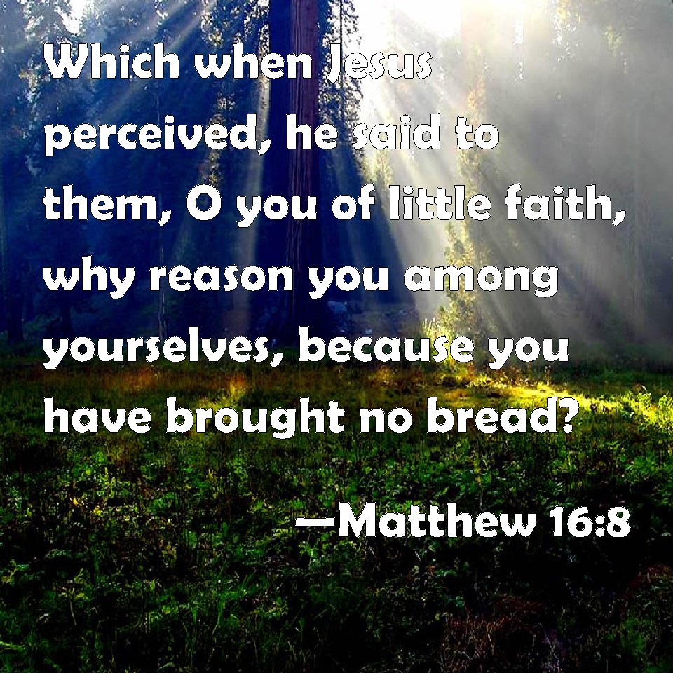 Choose a Background Matthew 16:8 Which when Jesus perceived, he said to them, O you of little faith, why reason you among yourselves, because you have brought no bread? KJV: Which when Jesus perceived, he said unto them, O ye of little faith, why reason ye among yourselves, because ye have brought no bread? DRB: And Jesus knowing it, said: Why do you think within yourselves, O ye of little faith, for that you have no bread? DBT: And Jesus knowing it, said, Why reason ye among yourselves, O ye of little faith, because ye have taken no bread? ERV: And Jesus perceiving it said, O ye of little faith, why reason ye among yourselves, because ye have no bread? WBT: Which when Jesus perceived, he said to them, O ye of little faith, why reason ye among yourselves, because ye have brought no bread? WEB: Jesus, perceiving it, said, "Why do you reason among yourselves, you of little faith, 'because you have brought no bread?' YLT: And Jesus having known, said to them, 'Why reason ye in yourselves, ye of little faith, because ye took no loaves?Links Matthew 16:8 NIV • Matthew 16:8 NLT • Matthew 16:8 ESV • Matthew 16:8 NASB • Matthew 16:8 KJV • Matthew 16:8 Interlinear • Matthew 16:8 Commentaries • Matthew 16:8 Parallel Texts • Matthew 16:8 Bible Apps • Matthew 16:8 Parallel • Bible Hub |