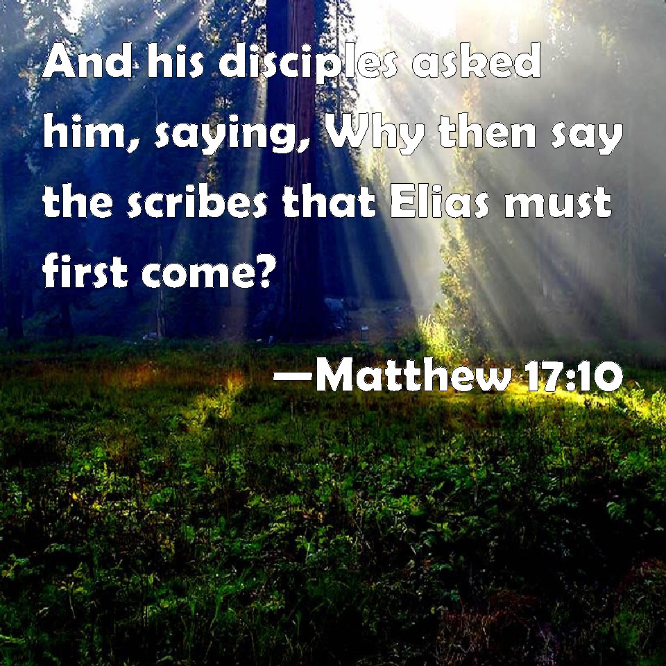 Choose a Background Matthew 17:10 And his disciples asked him, saying, Why then say the scribes that Elias must first come? KJV: And his disciples asked him, saying, Why then say the scribes that Elias must first come? DRB: And his disciples asked him, saying: Why then do the scribes say that Elias must come first? DBT: And his disciples demanded of him saying, Why then say the scribes that Elias must first have come? ERV: And his disciples asked him, saying, Why then say the scribes that Elijah must first come? WBT: And his disciples asked him, saying, Why then say the scribes, that Elijah must first come? WEB: His disciples asked him, saying, "Then why do the scribes say that Elijah must come first?" YLT: And his disciples questioned him, saying, 'Why then do the scribes say that Elijah it behoveth to come first?'Links Matthew 17:10 NIV • Matthew 17:10 NLT • Matthew 17:10 ESV • Matthew 17:10 NASB • Matthew 17:10 KJV • Matthew 17:10 Interlinear • Matthew 17:10 Commentaries • Matthew 17:10 Parallel Texts • Matthew 17:10 Bible Apps • Matthew 17:10 Parallel • Bible Hub |