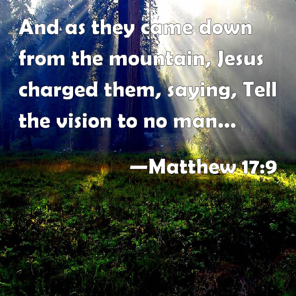 Choose a Background Matthew 17:9 And as they came down from the mountain, Jesus charged them, saying, Tell the vision to no man, until the Son of man be risen again from the dead. KJV: And as they came down from the mountain, Jesus charged them, saying, Tell the vision to no man, until the Son of man be risen again from the dead. DRB: And as they came down from the mountain, Jesus charged them, saying: Tell the vision to no man, till the Son of man be risen from the dead. DBT: And as they descended from the mountain, Jesus charged them, saying, Tell the vision to no one, until the Son of man be risen up from among the dead. ERV: And as they were coming down from the mountain, Jesus commanded them, saying, Tell the vision to no man, until the Son of man be risen from the dead. WBT: And as they were descending the mountain, Jesus charged them, saying, Tell the vision to no man, until the Son of man be raised again from the dead. WEB: As they were coming down from the mountain, Jesus commanded them, saying, "Don't tell anyone what you saw, until the Son of Man has risen from the dead." YLT: And as they are coming down from the mount, Jesus charged them, saying, 'Say to no one the vision, till the Son of Man out of the dead may rise.'Links Matthew 17:9 NIV • Matthew 17:9 NLT • Matthew 17:9 ESV • Matthew 17:9 NASB • Matthew 17:9 KJV • Matthew 17:9 Interlinear • Matthew 17:9 Commentaries • Matthew 17:9 Parallel Texts • Matthew 17:9 Bible Apps • Matthew 17:9 Parallel • Bible Hub |