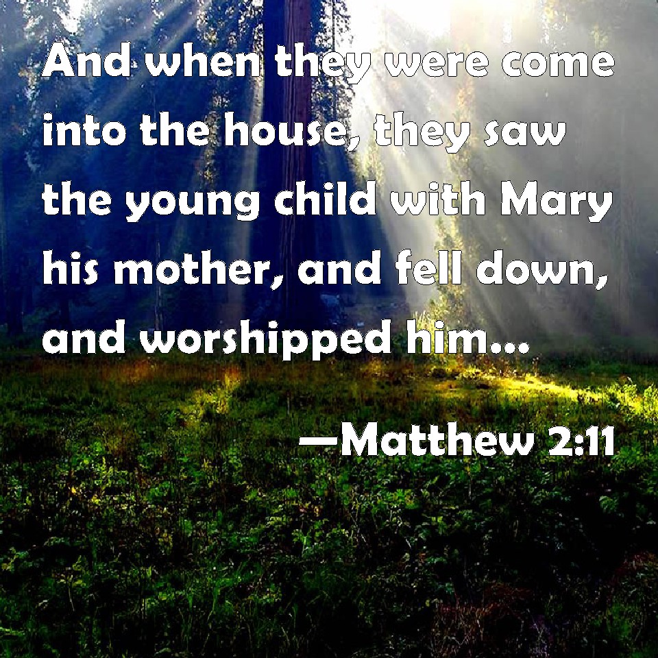 Choose a Background Matthew 2:11 And when they were come into the house, they saw the young child with Mary his mother, and fell down, and worshipped him: and when they had opened their treasures, they presented to him gifts; gold, and frankincense and myrrh. KJV: And when they were come into the house, they saw the young child with Mary his mother, and fell down, and worshipped him: and when they had opened their treasures, they presented unto him gifts; gold, and frankincense, and myrrh. DRB: And entering into the house, they found the child with Mary his mother, and falling down they adored him; and opening their treasures, they offered him gifts; gold, frankincense, and myrrh. DBT: And having come into the house they saw the little child with Mary his mother, and falling down did him homage. And having opened their treasures, they offered to him gifts, gold, and frankincense, and myrrh. ERV: And they came into the house and saw the young child with Mary his mother; and they fell down and worshipped him; and opening their treasures they offered unto him gifts, gold and frankincense and myrrh. WBT: And when they had come into the house, they saw the young child with Mary his mother, and fell down, and worshiped him: and when they had opened their treasures, they presented to him gifts; gold, and frankincense, and myrrh. WEB: They came into the house and saw the young child with Mary, his mother, and they fell down and worshiped him. Opening their treasures, they offered to him gifts: gold, frankincense, and myrrh. YLT: and having come to the house, they found the child with Mary his mother, and having fallen down they bowed to him, and having opened their treasures, they presented to him gifts, gold, and frankincense, and myrrh,Links Matthew 2:11 NIV • Matthew 2:11 NLT • Matthew 2:11 ESV • Matthew 2:11 NASB • Matthew 2:11 KJV • Matthew 2:11 Interlinear • Matthew 2:11 Commentaries • Matthew 2:11 Parallel Texts • Matthew 2:11 Bible Apps • Matthew 2:11 Parallel • Bible Hub |