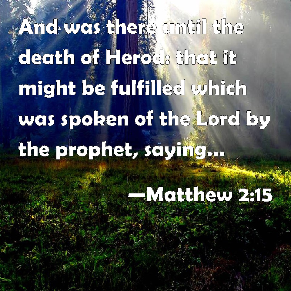 Choose a Background Matthew 2:15 And was there until the death of Herod: that it might be fulfilled which was spoken of the Lord by the prophet, saying, Out of Egypt have I called my son. KJV: And was there until the death of Herod: that it might be fulfilled which was spoken of the Lord by the prophet, saying, Out of Egypt have I called my son. DRB: That it might be fulfilled which the Lord spoke by the prophet, saying: Out of Egypt have I called my son. DBT: And he was there until the death of Herod, that that might be fulfilled which was spoken by the Lord through the prophet, saying, Out of Egypt have I called my son. ERV: and was there until the death of Herod: that it might be fulfilled which was spoken by the Lord through the prophet, saying, Out of Egypt did I call my son. WBT: And was there until the death of Herod: that it might be fulfilled which was spoken from the Lord by the prophet, saying, Out of Egypt have I called my son. WEB: and was there until the death of Herod; that it might be fulfilled which was spoken by the Lord through the prophet, saying, "Out of Egypt I called my son." YLT: and he was there till the death of Herod, that it might be fulfilled that was spoken by the Lord through the prophet, saying, 'Out of Egypt I did call My Son.'Links Matthew 2:15 NIV • Matthew 2:15 NLT • Matthew 2:15 ESV • Matthew 2:15 NASB • Matthew 2:15 KJV • Matthew 2:15 Interlinear • Matthew 2:15 Commentaries • Matthew 2:15 Parallel Texts • Matthew 2:15 Bible Apps • Matthew 2:15 Parallel • Bible Hub |