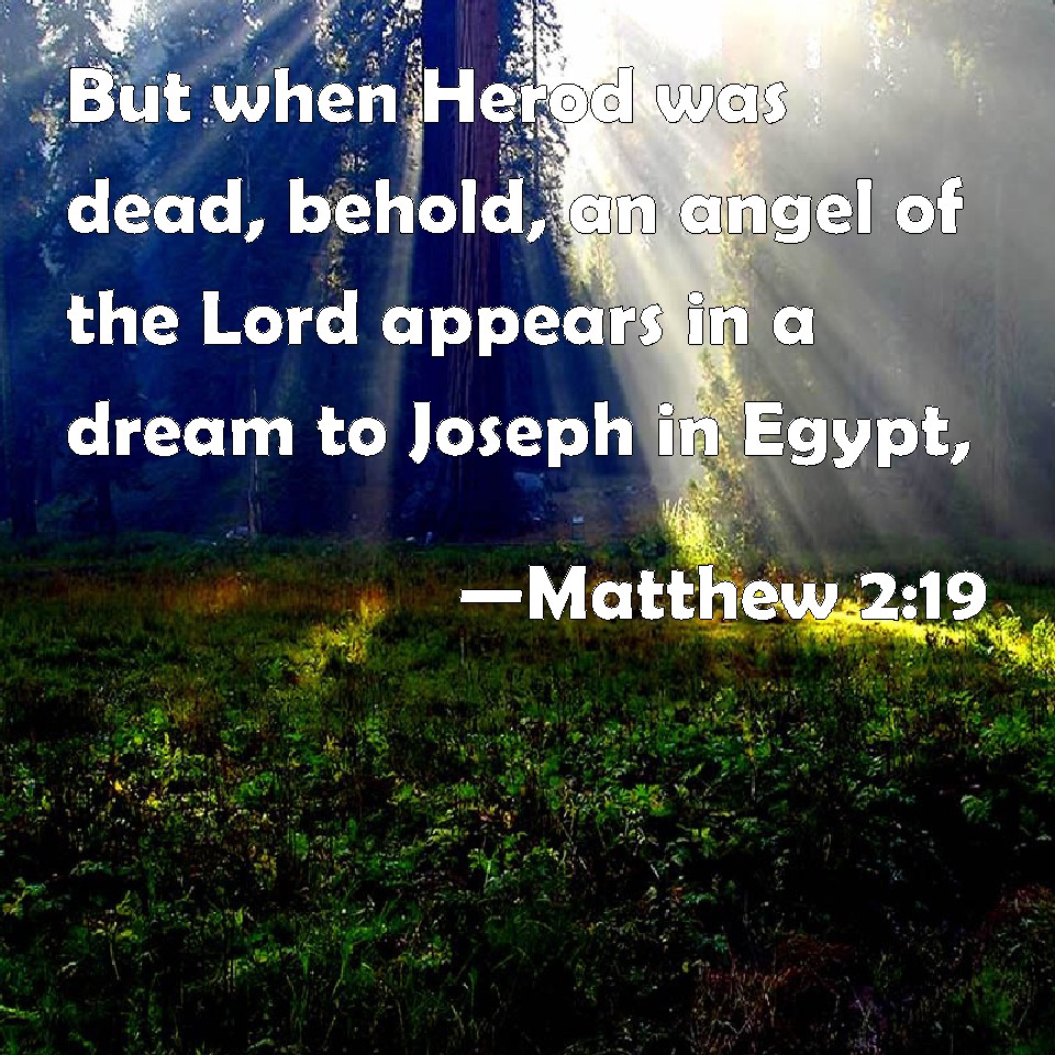 Choose a Background Matthew 2:19 But when Herod was dead, behold, an angel of the Lord appears in a dream to Joseph in Egypt, KJV: But when Herod was dead, behold, an angel of the Lord appeareth in a dream to Joseph in Egypt, DRB: But when Herod was dead, behold an angel of the Lord appeared in sleep to Joseph in Egypt, DBT: But Herod having died, behold, an angel of the Lord appears in a dream to Joseph in Egypt, saying, ERV: But when Herod was dead, behold, an angel of the Lord appeareth in a dream to Joseph in Egypt, WBT: But when Herod was dead, behold, an angel of the Lord appeareth in a dream to Joseph in Egypt, WEB: But when Herod was dead, behold, an angel of the Lord appeared in a dream to Joseph in Egypt, saying, YLT: And Herod having died, lo, a messenger of the Lord in a dream doth appear to Joseph in Egypt,Links Matthew 2:19 NIV • Matthew 2:19 NLT • Matthew 2:19 ESV • Matthew 2:19 NASB • Matthew 2:19 KJV • Matthew 2:19 Interlinear • Matthew 2:19 Commentaries • Matthew 2:19 Parallel Texts • Matthew 2:19 Bible Apps • Matthew 2:19 Parallel • Bible Hub |