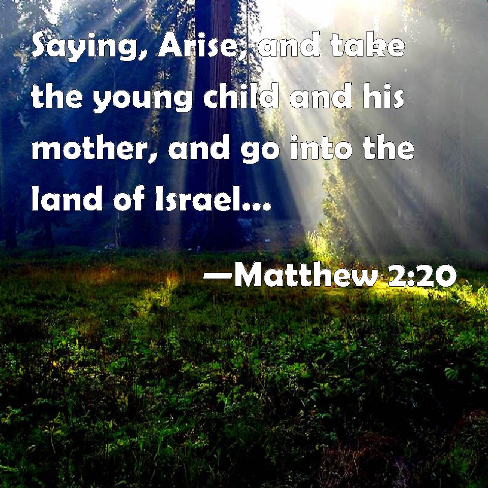 Choose a Background Matthew 2:20 Saying, Arise, and take the young child and his mother, and go into the land of Israel: for they are dead which sought the young child's life. KJV: Saying, Arise, and take the young child and his mother, and go into the land of Israel: for they are dead which sought the young child's life. DRB: Saying: Arise, and take the child and his mother, and go into the land of Israel. For they are dead that sought the life of the child. DBT: Arise, take to thee the little child and its mother, and go into the land of Israel: for they who sought the life of the little child are dead. ERV: saying, Arise and take the young child and his mother, and go into the land of Israel: for they are dead that sought the young child's life. WBT: Saying, Arise, and take the young child and his mother, and go into the land of Israel: for they are dead who sought the young child's life. WEB: "Arise and take the young child and his mother, and go into the land of Israel, for those who sought the young child's life are dead." YLT: saying, 'Having risen, take the child and his mother, and be going to the land of Israel, for they have died — those seeking the life of the child.'Links Matthew 2:20 NIV • Matthew 2:20 NLT • Matthew 2:20 ESV • Matthew 2:20 NASB • Matthew 2:20 KJV • Matthew 2:20 Interlinear • Matthew 2:20 Commentaries • Matthew 2:20 Parallel Texts • Matthew 2:20 Bible Apps • Matthew 2:20 Parallel • Bible Hub |