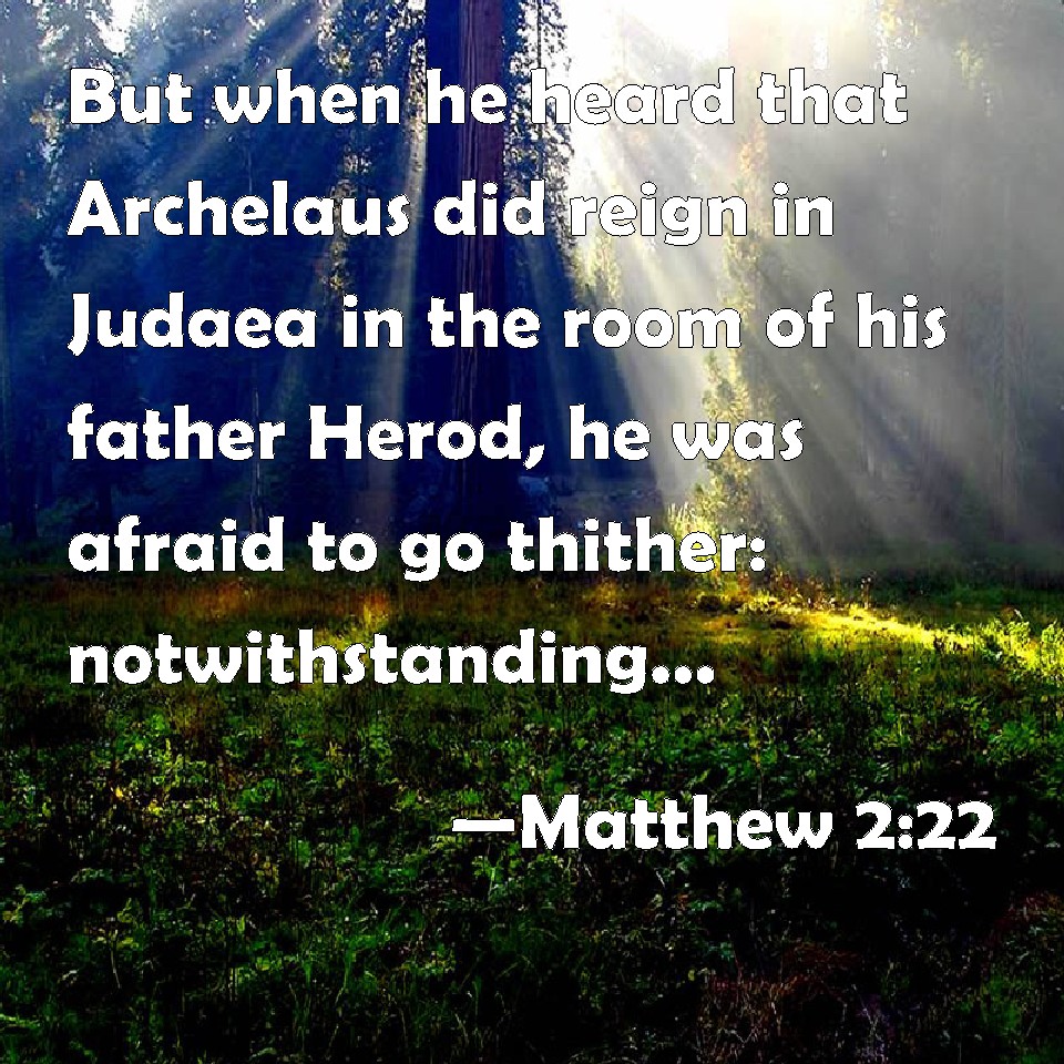 Choose a Background Matthew 2:22 But when he heard that Archelaus did reign in Judaea in the room of his father Herod, he was afraid to go thither: notwithstanding, being warned of God in a dream, he turned aside into the parts of Galilee: KJV: But when he heard that Archelaus did reign in Judaea in the room of his father Herod, he was afraid to go thither: notwithstanding, being warned of God in a dream, he turned aside into the parts of Galilee: DRB: But hearing that Archelaus reigned in Judea in the room of Herod his father, he was afraid to go thither: and being warned in sleep retired into the quarters of Galilee. DBT: but having heard that 'Archelaus reigns over Judaea, instead of Herod his father,' he was afraid to go there; and having been divinely instructed in a dream, he went away into the parts of Galilee, ERV: But when he heard that Archelaus was reigning over Judaea in the room of his father Herod, he was afraid to go thither; and being warned of God in a dream, he withdrew into the parts of Galilee, WBT: But when he heard that Archelaus reigned in Judea in the room of his father Herod, he was afraid to go thither: notwithstanding, being warned by God in a dream, he turned aside into the parts of Galilee: WEB: But when he heard that Archelaus was reigning over Judea in the place of his father, Herod, he was afraid to go there. Being warned in a dream, he withdrew into the region of Galilee, YLT: and having heard that Archelaus doth reign over Judea instead of Herod his father, he was afraid to go thither, and having been divinely warned in a dream, he withdrew to the parts of Galilee,Links Matthew 2:22 NIV • Matthew 2:22 NLT • Matthew 2:22 ESV • Matthew 2:22 NASB • Matthew 2:22 KJV • Matthew 2:22 Interlinear • Matthew 2:22 Commentaries • Matthew 2:22 Parallel Texts • Matthew 2:22 Bible Apps • Matthew 2:22 Parallel • Bible Hub |