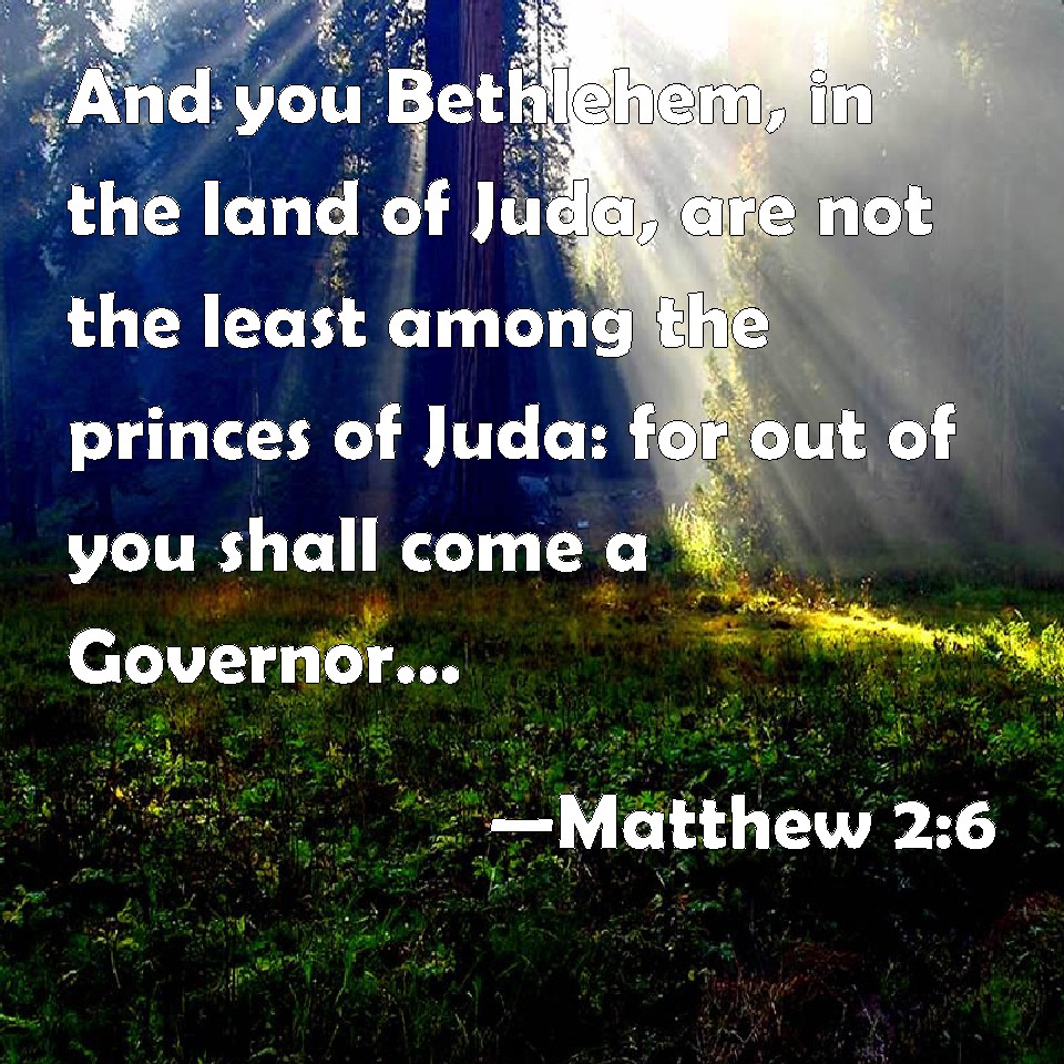 Choose a Background Matthew 2:6 And you Bethlehem, in the land of Juda, are not the least among the princes of Juda: for out of you shall come a Governor, that shall rule my people Israel. KJV: And thou Bethlehem, in the land of Juda, art not the least among the princes of Juda: for out of thee shall come a Governor, that shall rule my people Israel. DRB: And thou Bethlehem the land of Juda art not the least among the princes of Juda: for out of thee shall come forth the captain that shall rule my people Israel. DBT: And thou Bethlehem, land of Juda, art in no wise the least among the governors of Juda; for out of thee shall go forth a leader who shall shepherd my people Israel. ERV: And thou Bethlehem, land of Judah, Art in no wise least among the princes of Judah: For out of thee shall come forth a governor, Which shall be shepherd of my people Israel. WBT: And thou Bethlehem, in the land of Judah, art not the least among the princes of Judah: for out of thee shall come a Governor, that shall rule my people Israel. WEB: 'You Bethlehem, land of Judah, are in no way least among the princes of Judah: for out of you shall come forth a governor, who shall shepherd my people, Israel.'" YLT: And thou, Beth-Lehem, the land of Judah, thou art by no means the least among the leaders of Judah, for out of thee shall come one leading, who shall feed My people Israel.'Links Matthew 2:6 NIV • Matthew 2:6 NLT • Matthew 2:6 ESV • Matthew 2:6 NASB • Matthew 2:6 KJV • Matthew 2:6 Interlinear • Matthew 2:6 Commentaries • Matthew 2:6 Parallel Texts • Matthew 2:6 Bible Apps • Matthew 2:6 Parallel • Bible Hub |